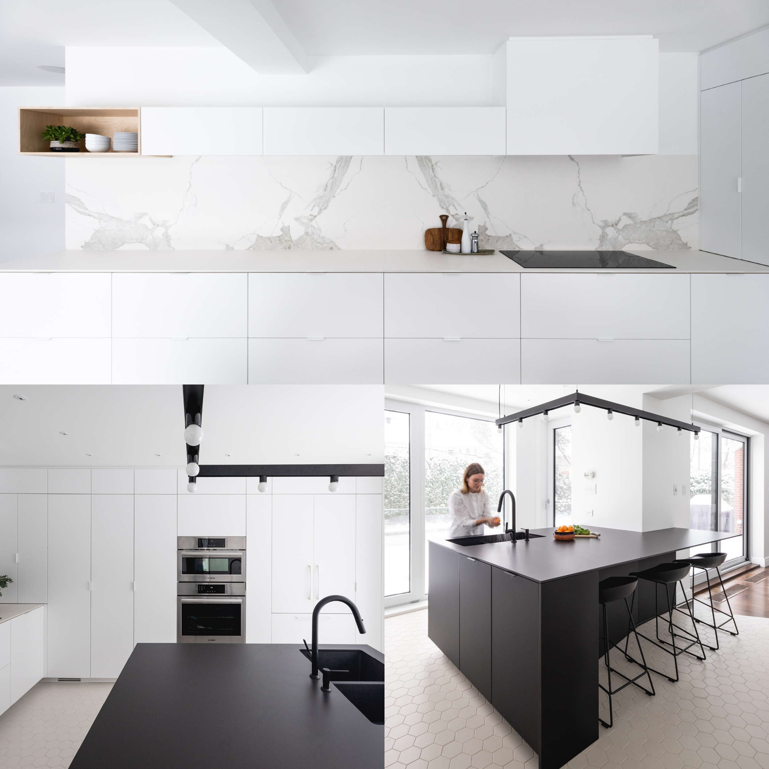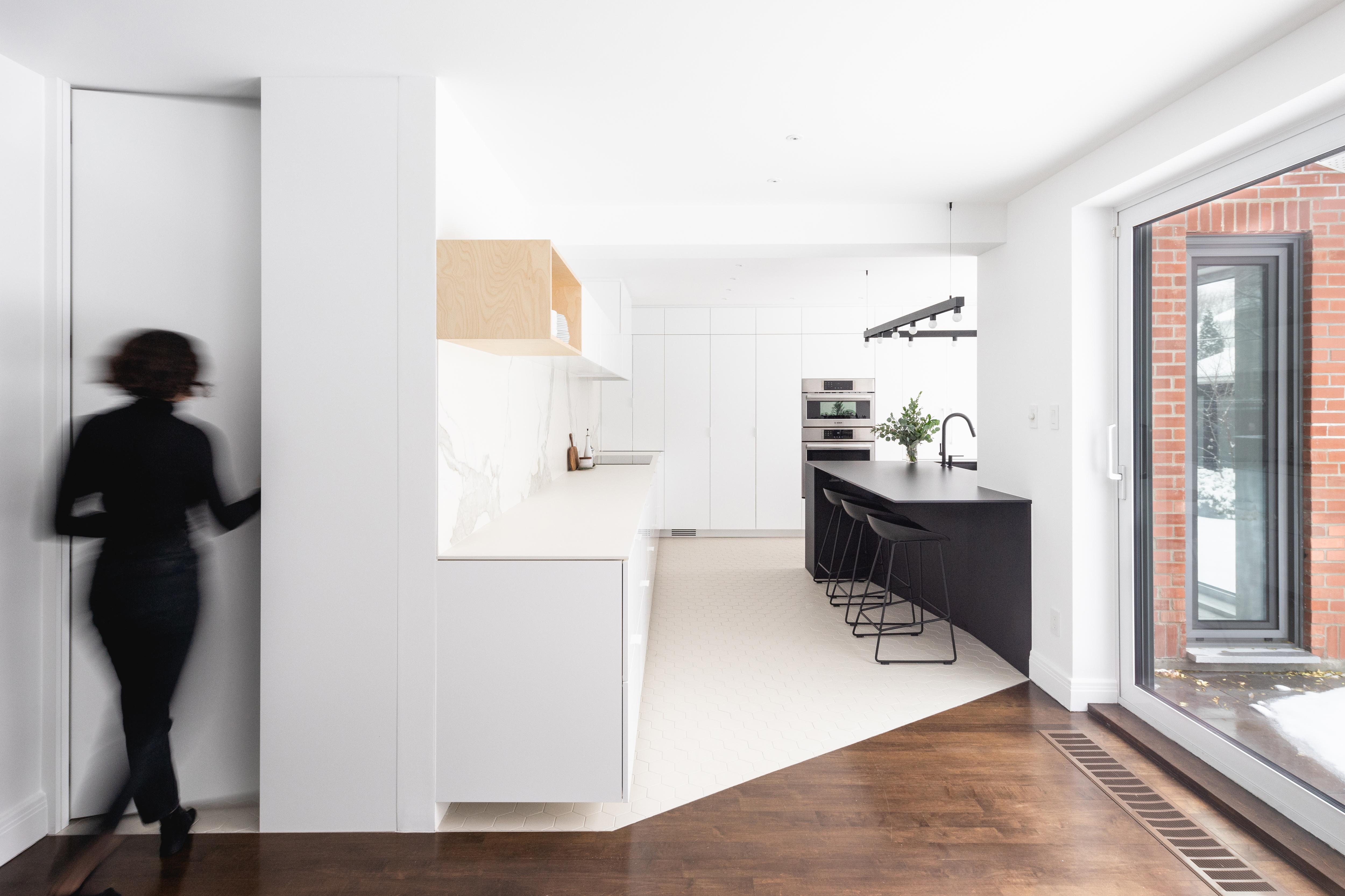 Amélie wanted a more welcoming kitchen that opens onto the rest of the space. The problem? Its set-back location framed by an arch. We redesigned the layout by stretching out the long countertops towards the dining room and by adding a nested island. The windows were moved and enlarged to add storage and better connect to the outside.