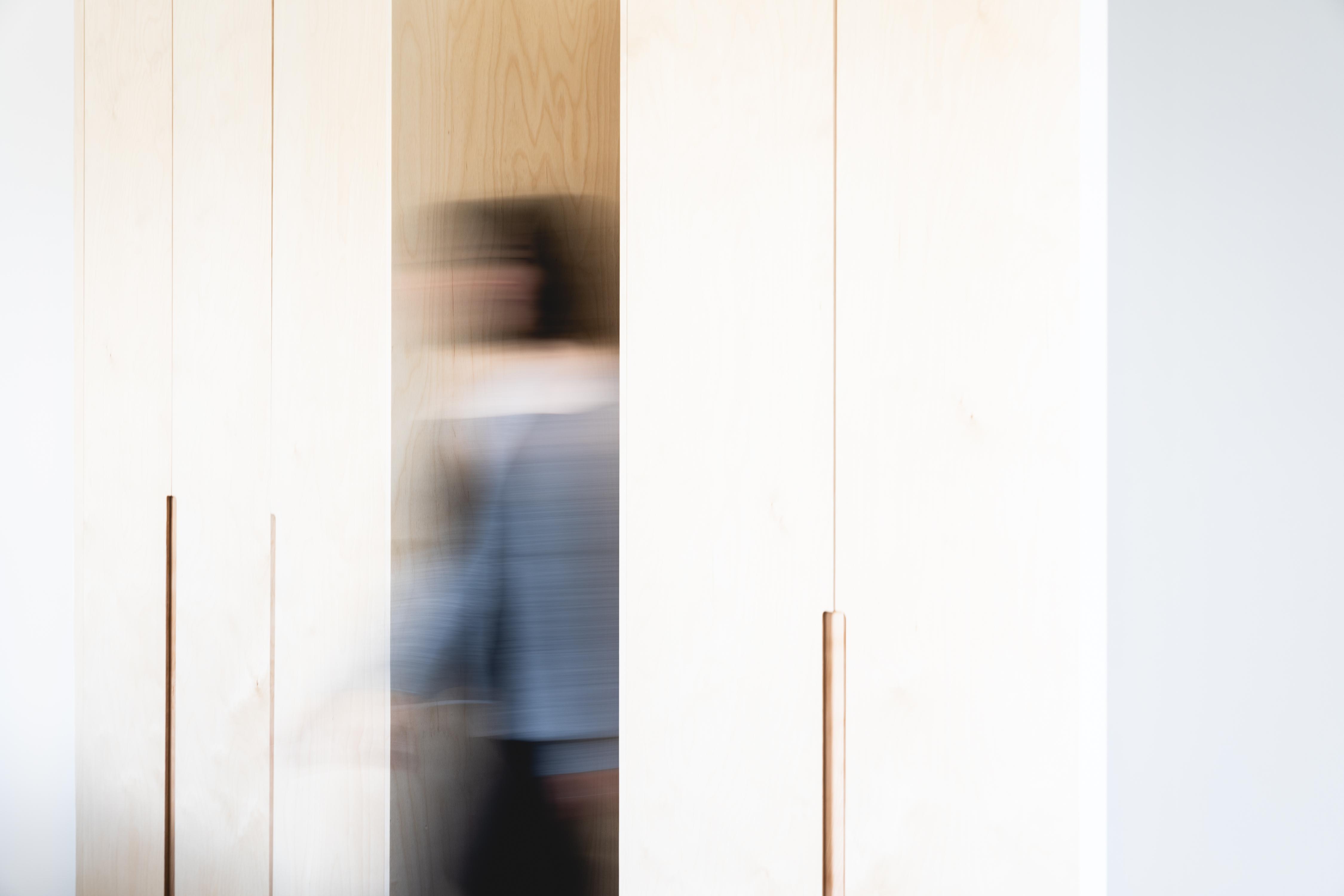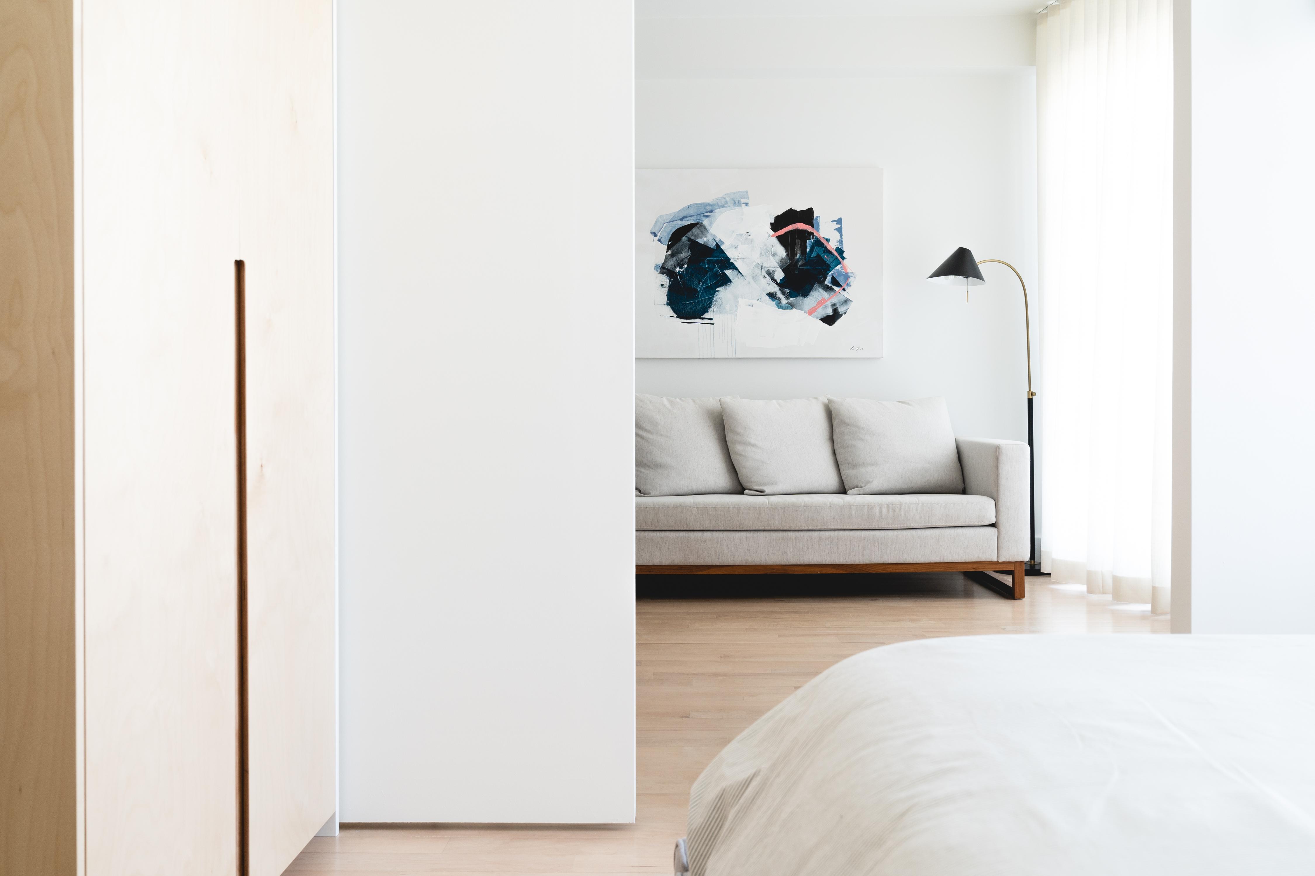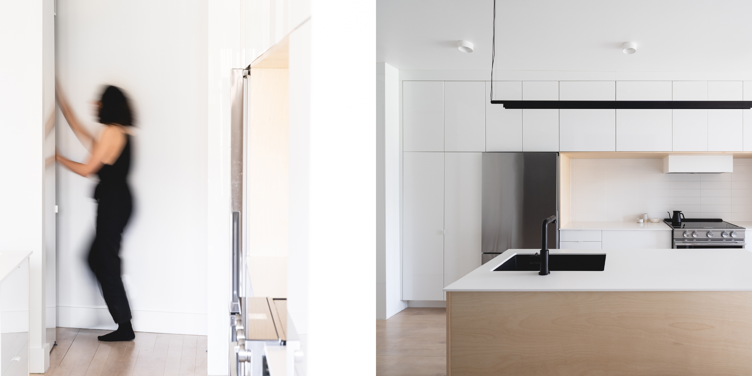 A couple returning to Montreal wanted to live in their Rosemont condo. The challenge? The small size of the apartment and the layout. We reduced the footprint of the bathroom, reoriented the kitchen and redesigned custom storage. Their home was designed to be open, but flexible thanks to large sliding doors that allow flexibility and to vary the intimacy of the space.