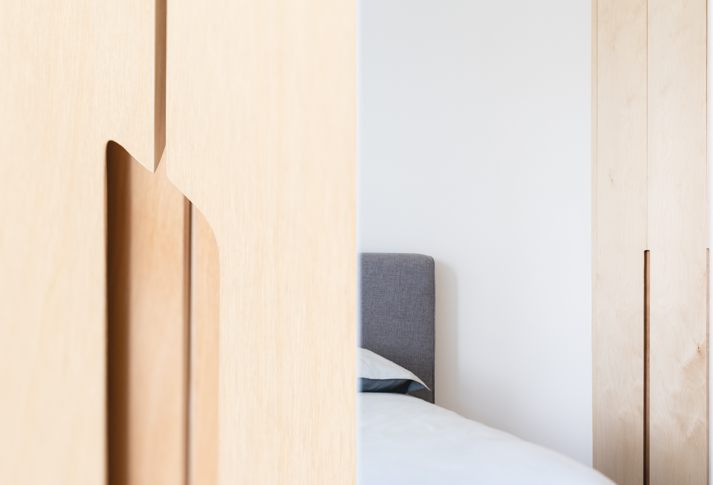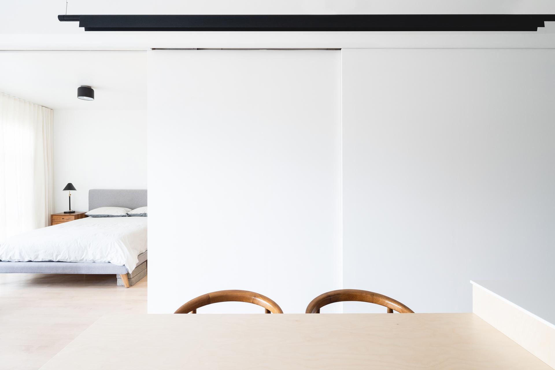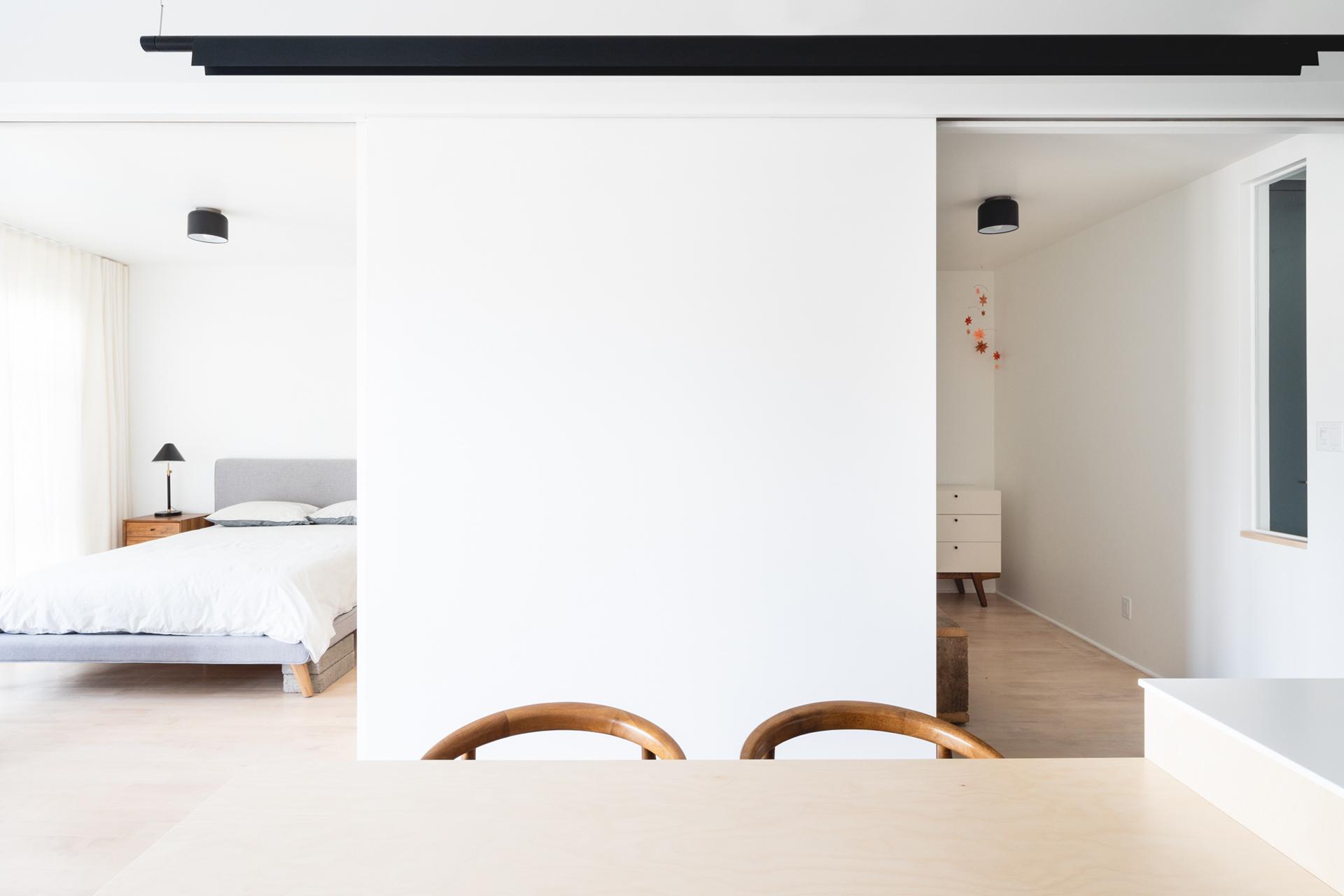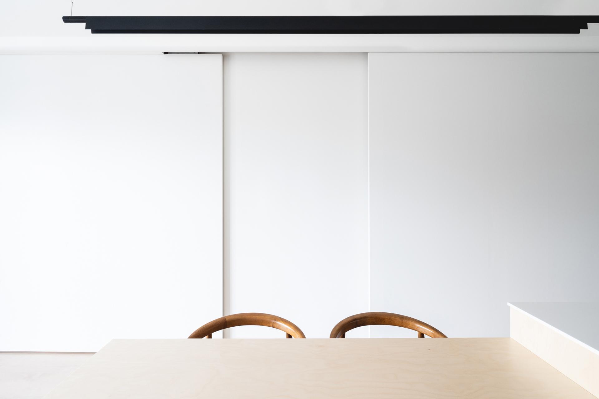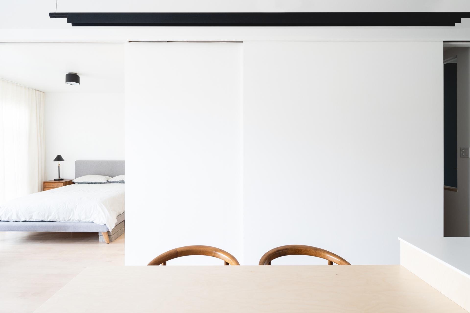 Sliding doors make it possible to close the rooms when needed without dividing the space on a daily basis.