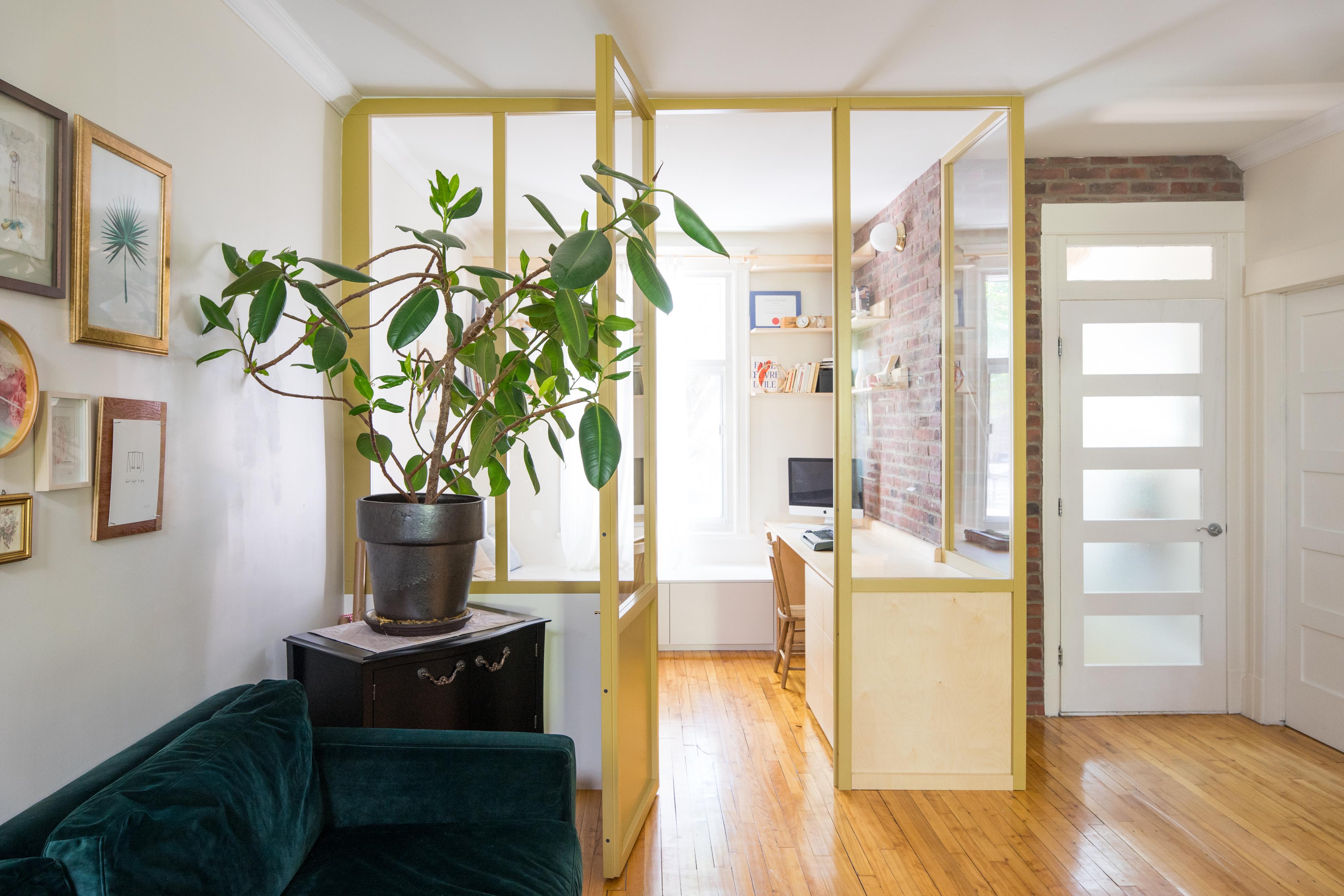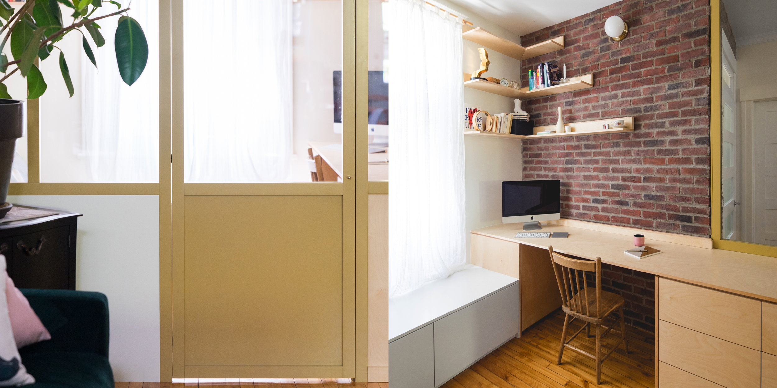 Sonia wanted to partition a space to have a separate office. The constraint? To divide the space without diminishing the amount of light the rest of the apartment gets. Our solution was to create an office space with custom furniture to maximize storage. We also designed a reading nook and a work table integrated into the partition itself, forming a textured graphic screen.