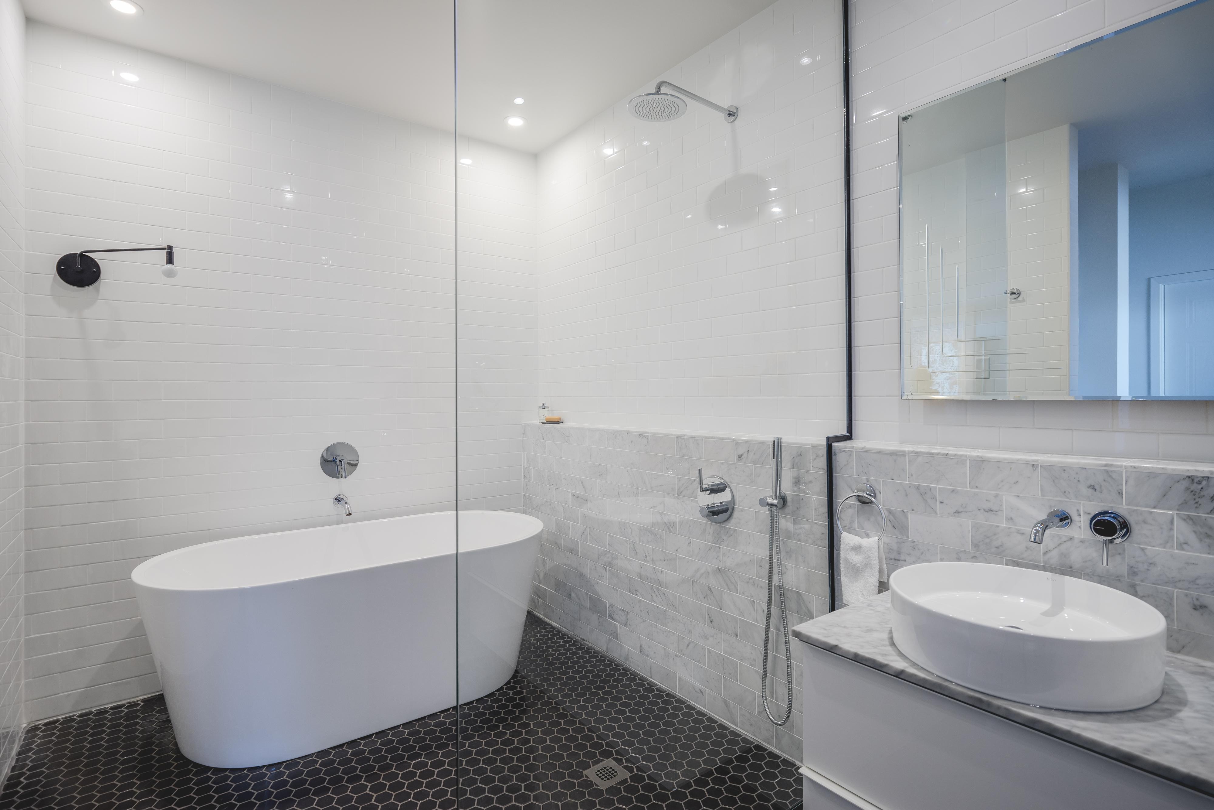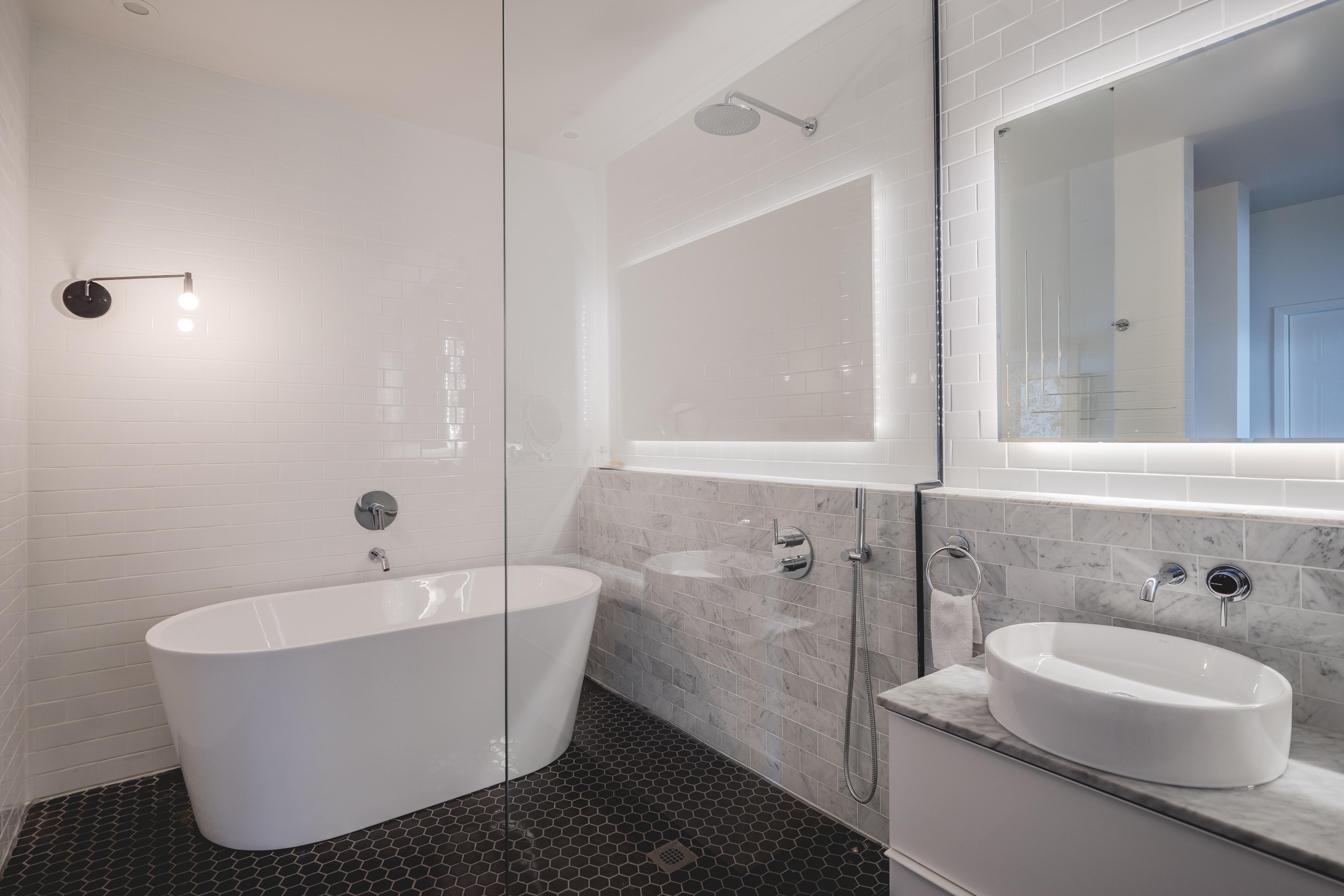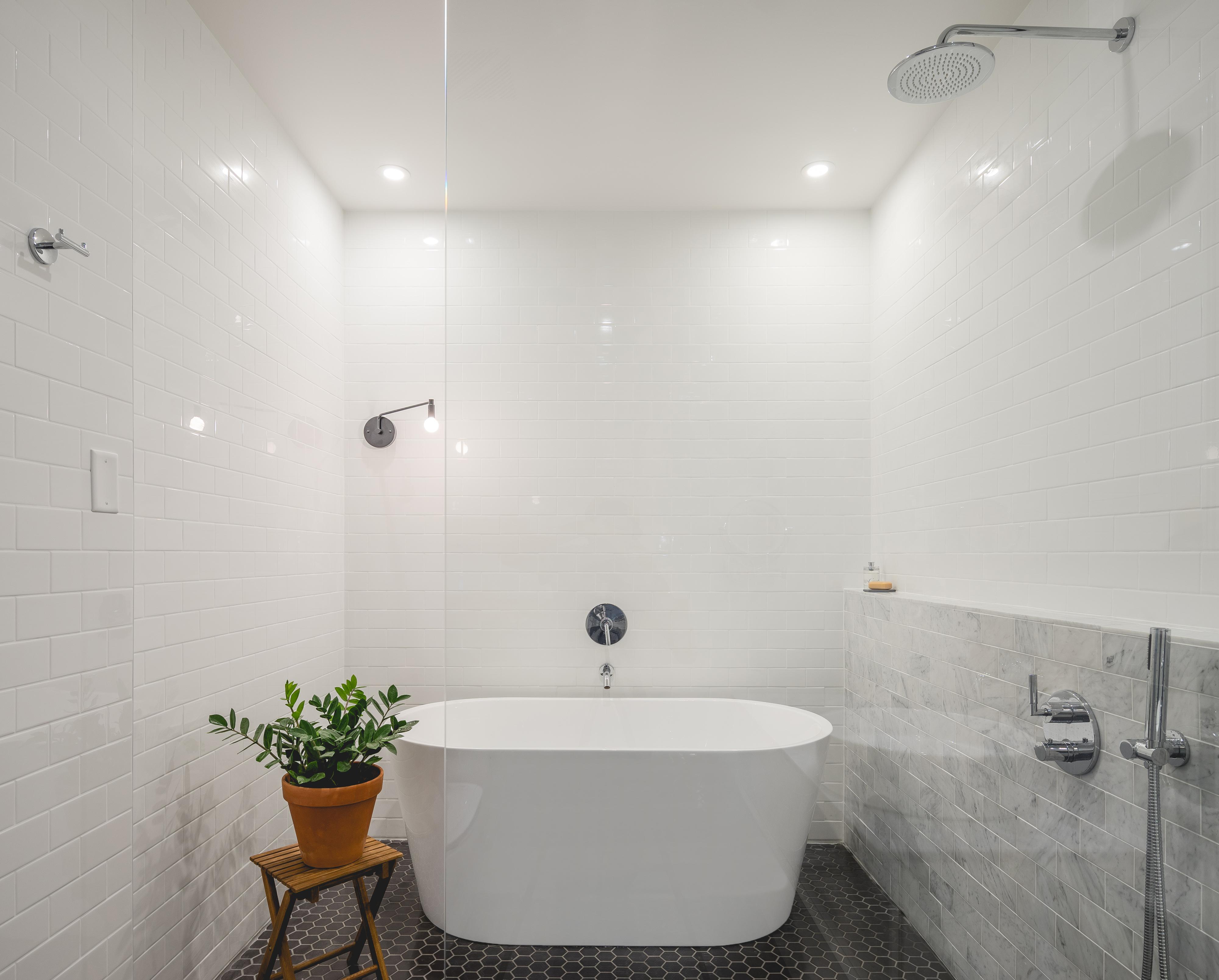 The clients wanted to make their bathroom more functional. The problem? No shower. We divided the space into two subspaces: one dry and one wet. The new material expression plays on textures and graphic effects. The bathroom is calm and welcoming.