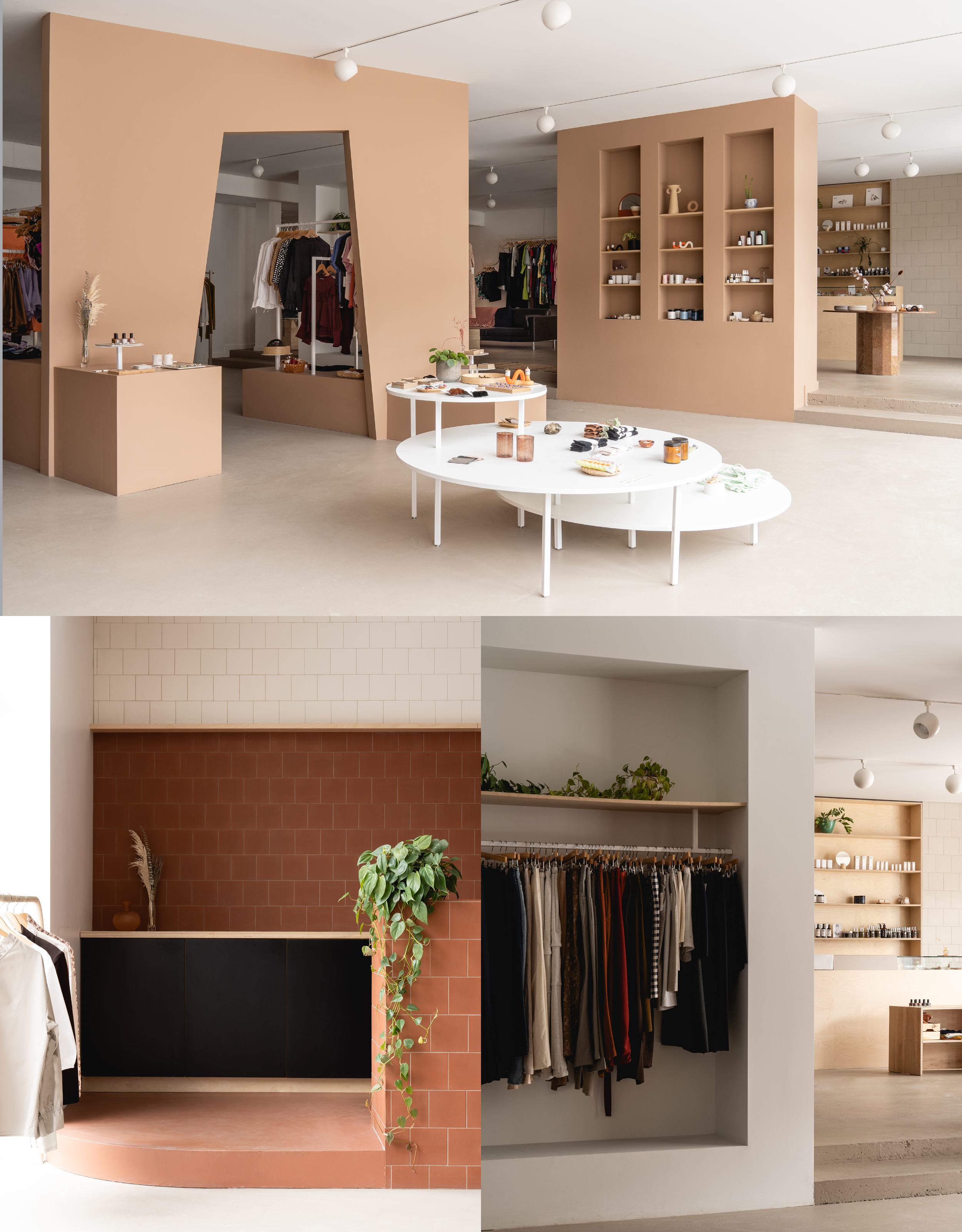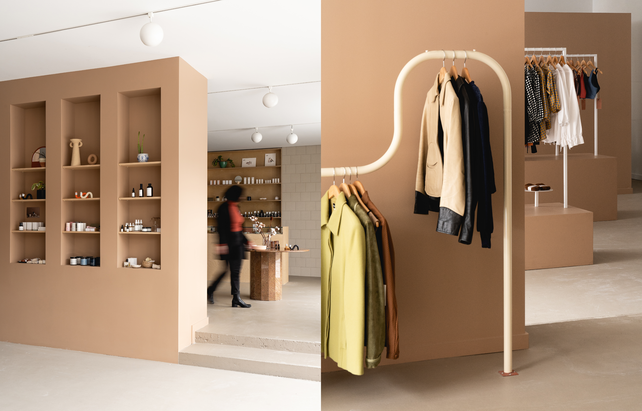 For their new store, Station Service wanted a warm and accessible space. Their challenge? Design the space by defining different zones adapted to their services and products. The layout of the space is a series of pink volumes arranged diagonally. The layout of the space is a series of pink volumes arranged diagonally, hosting fitting rooms, storage for clothes and privatizing an area for clothing rental.