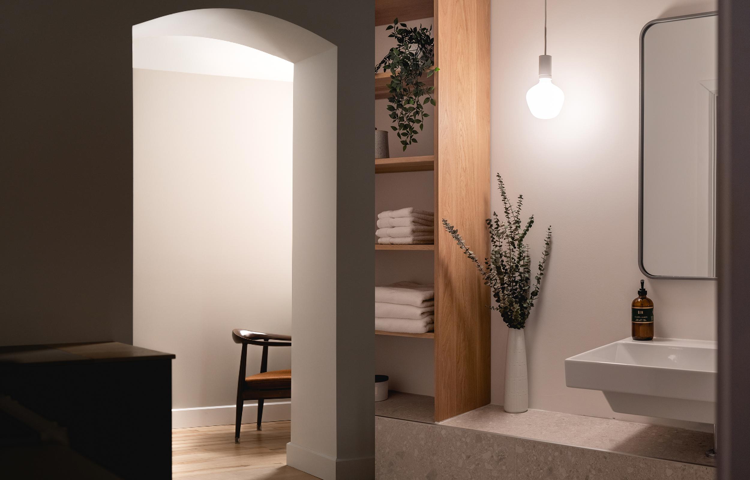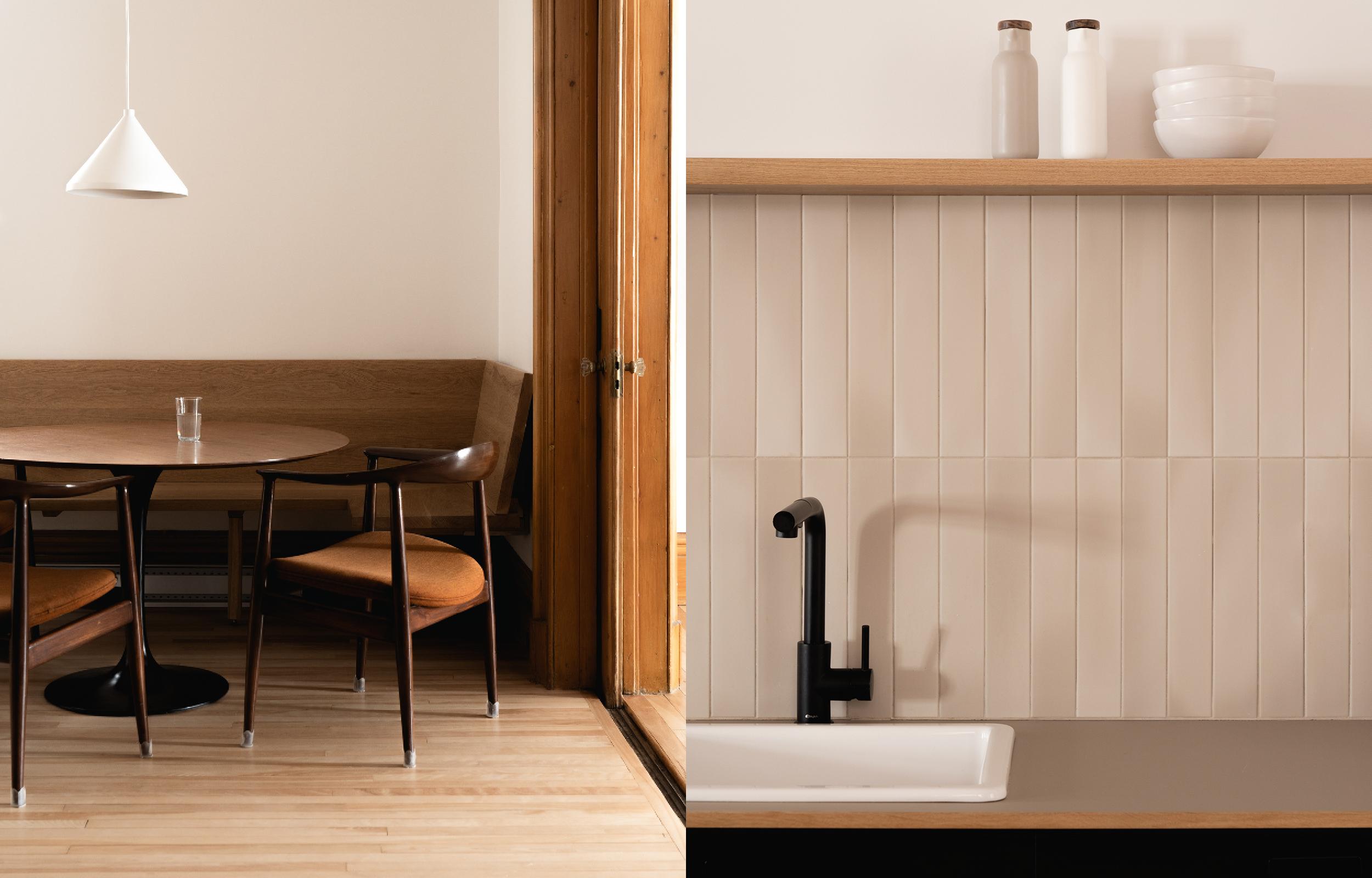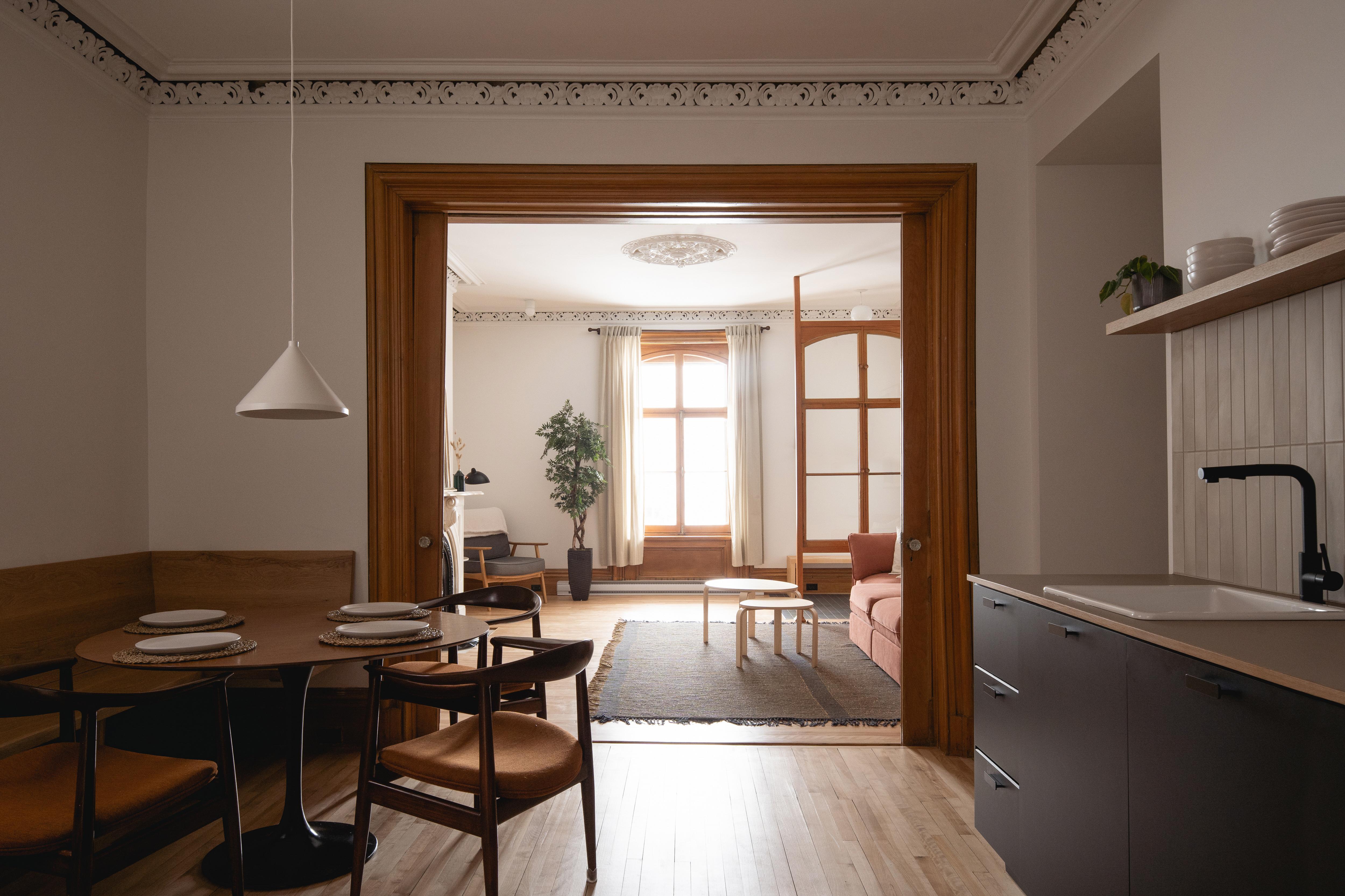 The challenge of this project was to convert a former sailboat sales office into housing. We redesigned the space to isolate the bedrooms at the back of the home, accessible from a passageway that integrates an office space. The kitchen in the center becomes the meeting place and offers a flexible seating area. We kept the existing architectural elements while modernizing the space.