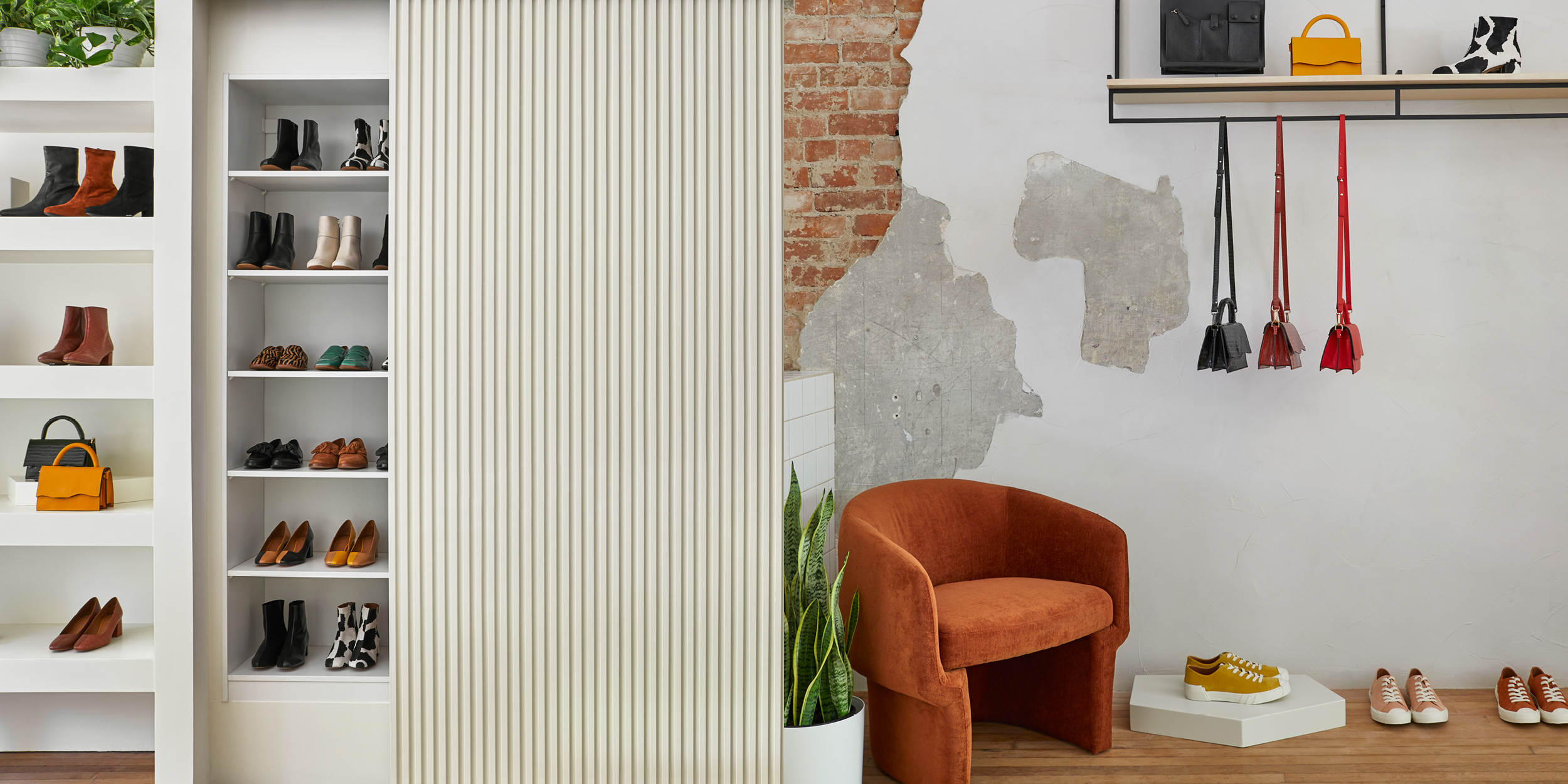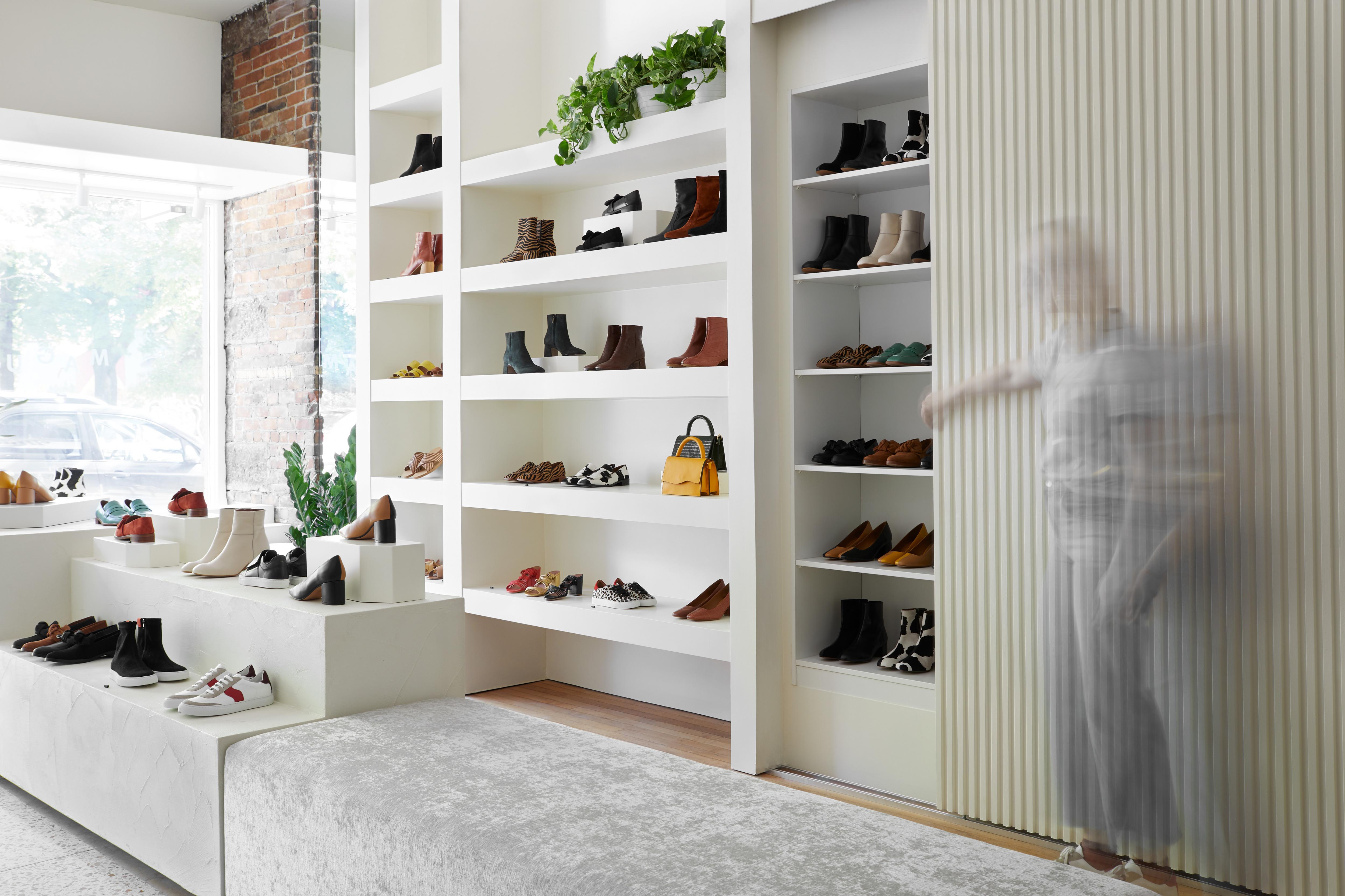 The narrow and linear space allows a stroll around a central block which juxtaposes seats and shoes displays.