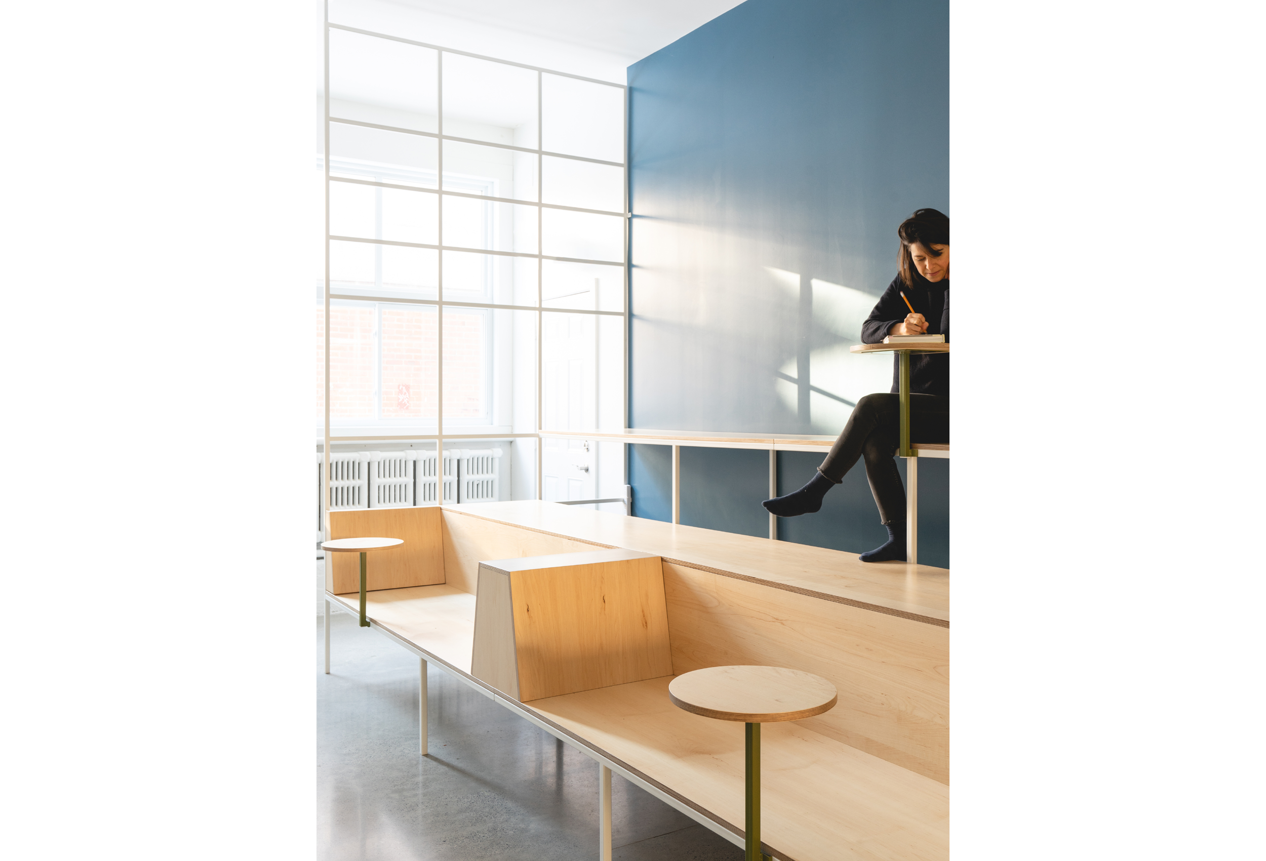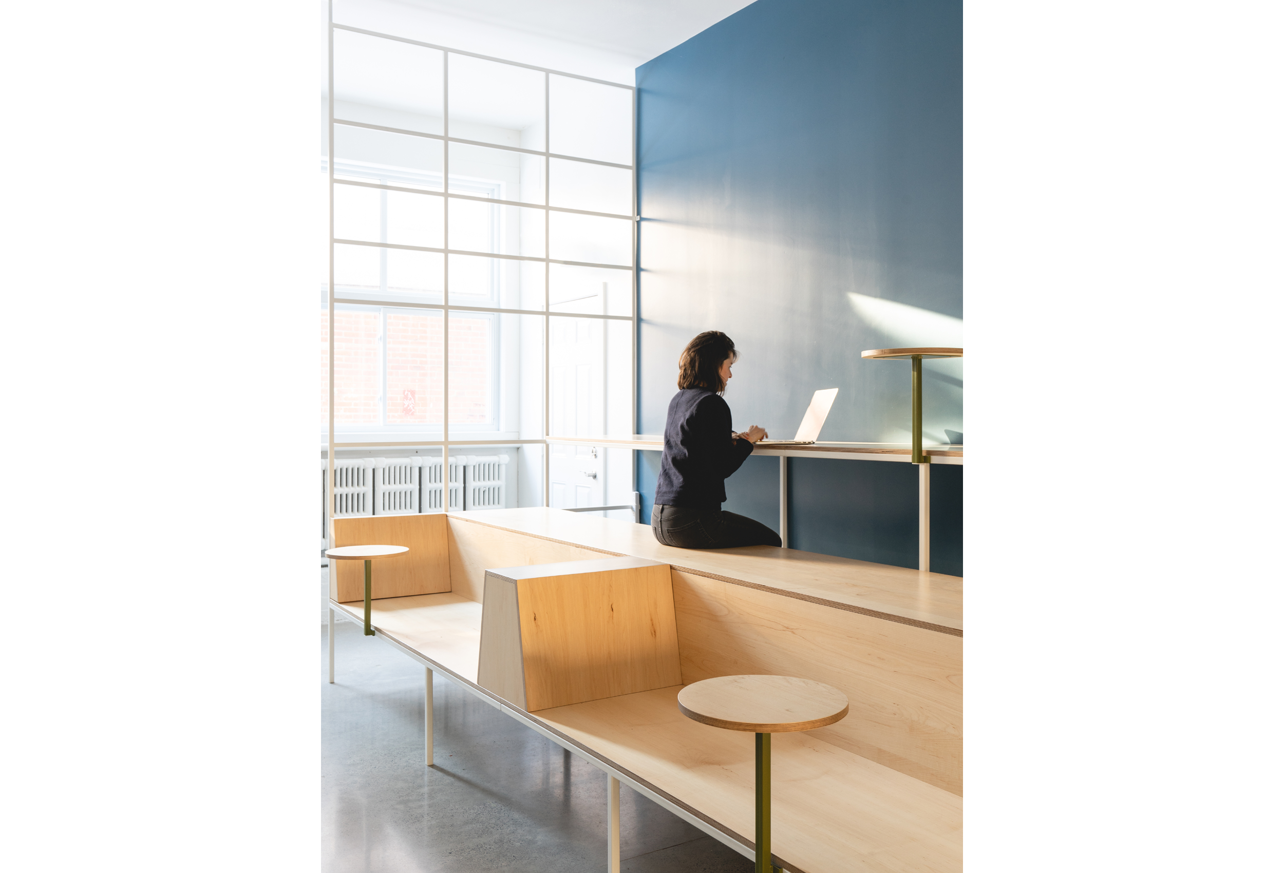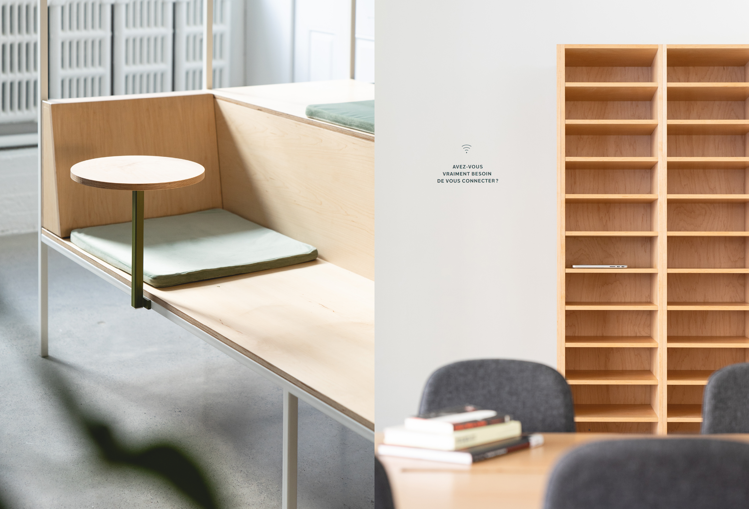 Thèsez-vous cherchait une façon de rendre son local multifonctionnel afin de passer d’un espace de rédaction, à une salle de conférence, pour terminer avec une cuisine multifonctionnelle. La contrainte ? La dimension restreinte du local, les fenêtres sur la rue passante et un espace étroit en retrait. Nous avons donc fait un plan d’aménagement avec une matérialité simple, tout en créant un espace dynamique et des zones bien définies grâce aux mobiliers sur-mesure.