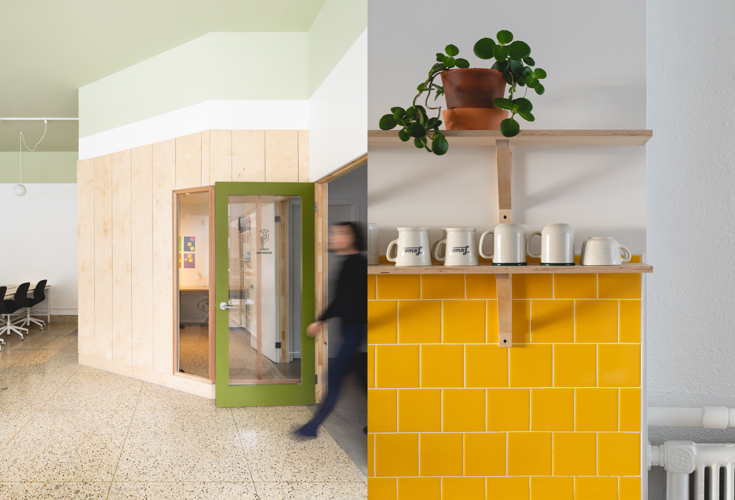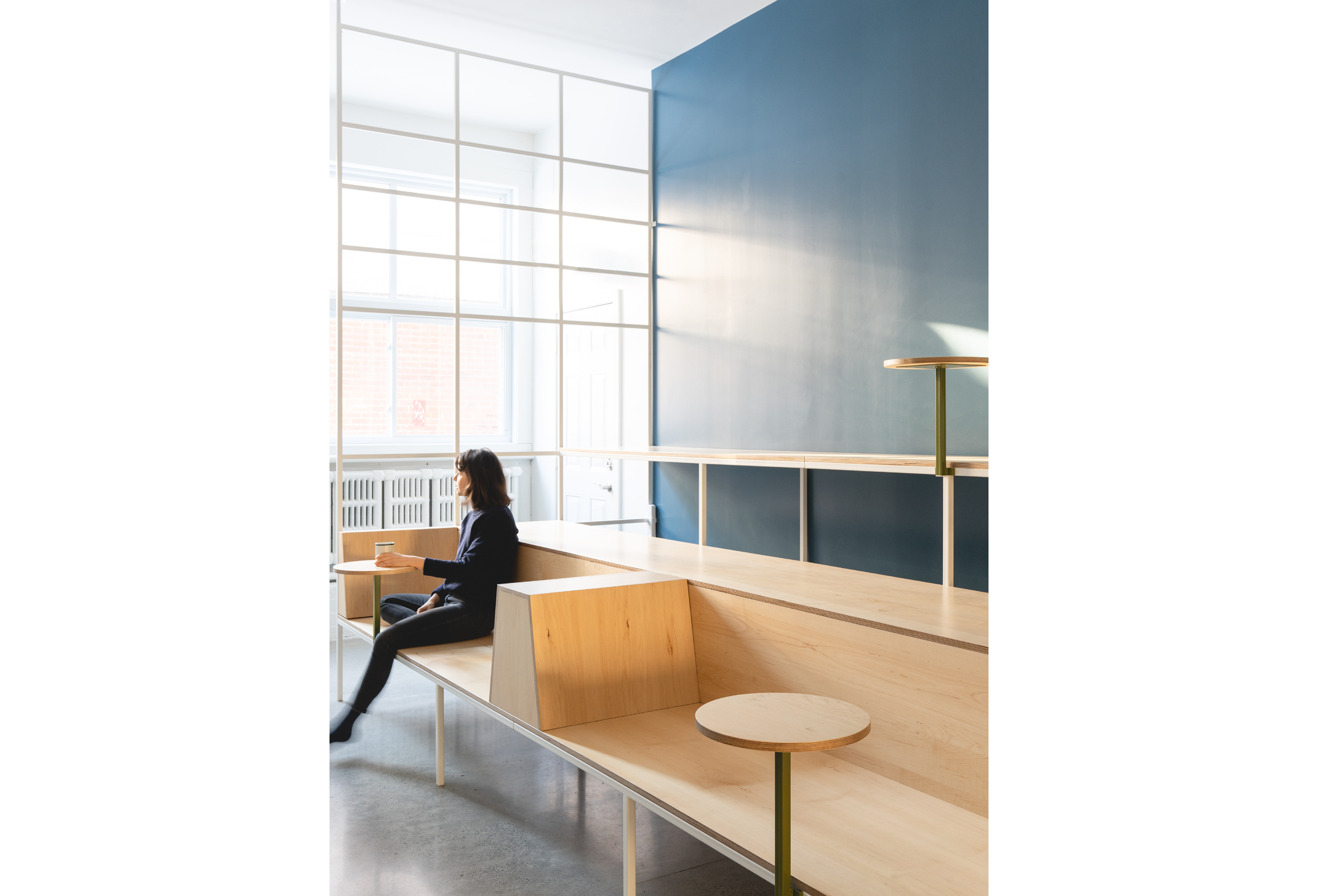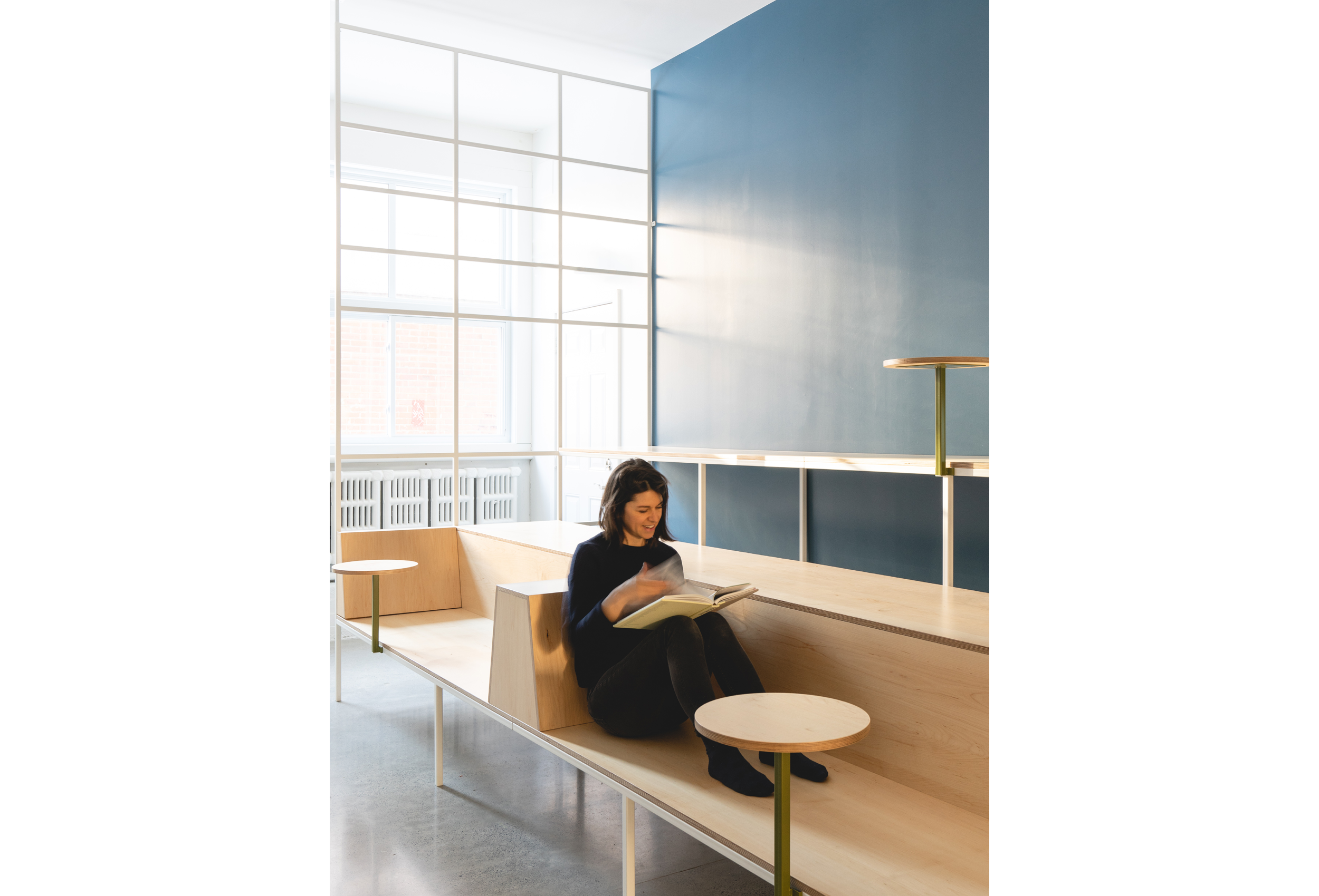 Thèsez-vous cherchait une façon de rendre son local multifonctionnel afin de passer d’un espace de rédaction, à une salle de conférence, pour terminer avec une cuisine multifonctionnelle. La contrainte ? La dimension restreinte du local, les fenêtres sur la rue passante et un espace étroit en retrait. Nous avons donc fait un plan d’aménagement avec une matérialité simple, tout en créant un espace dynamique et des zones bien définies grâce aux mobiliers sur-mesure.