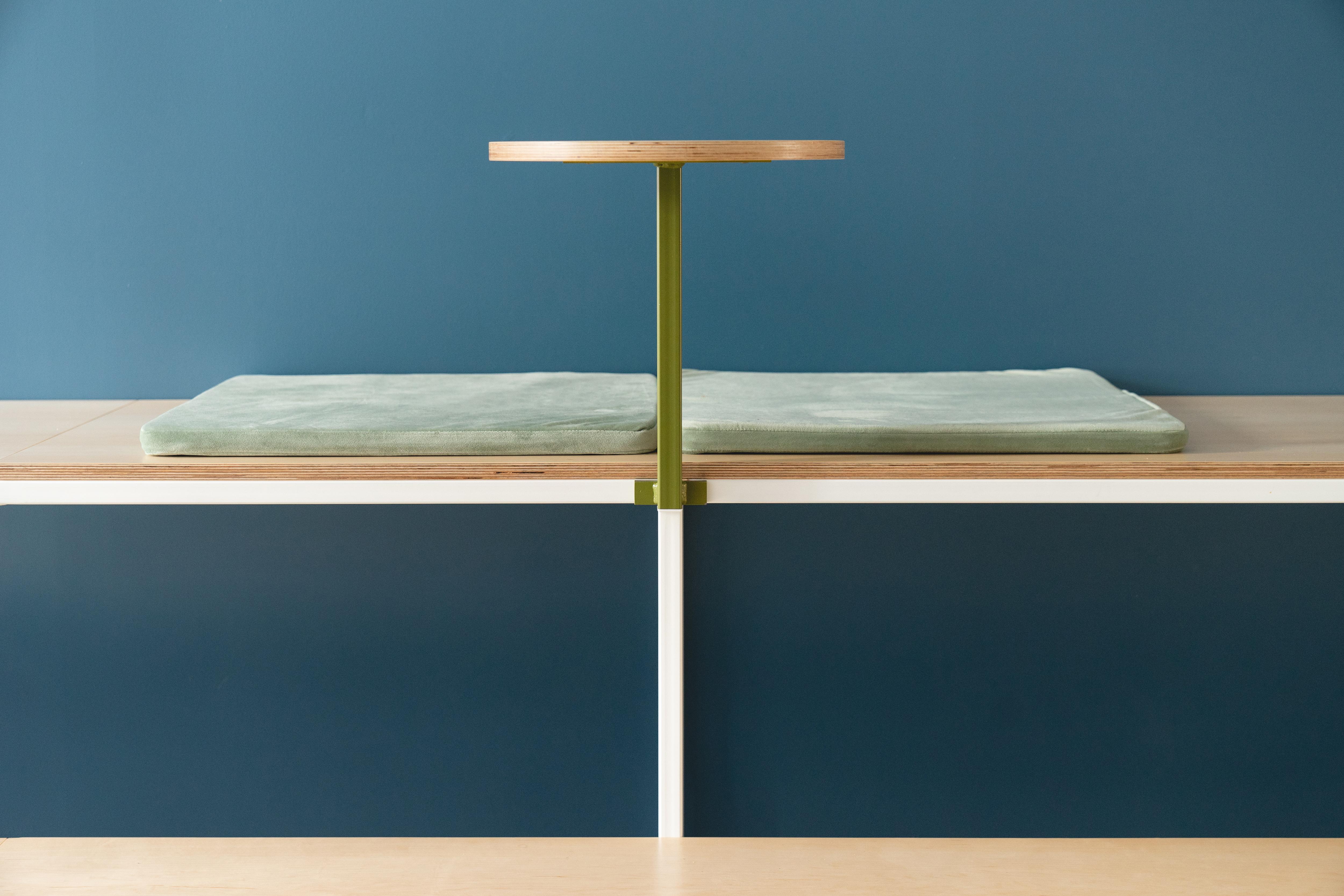 La cuisinette est aménagée en connexion avec une structure-podium permettant les rassemblements comme les moments d'isolement.