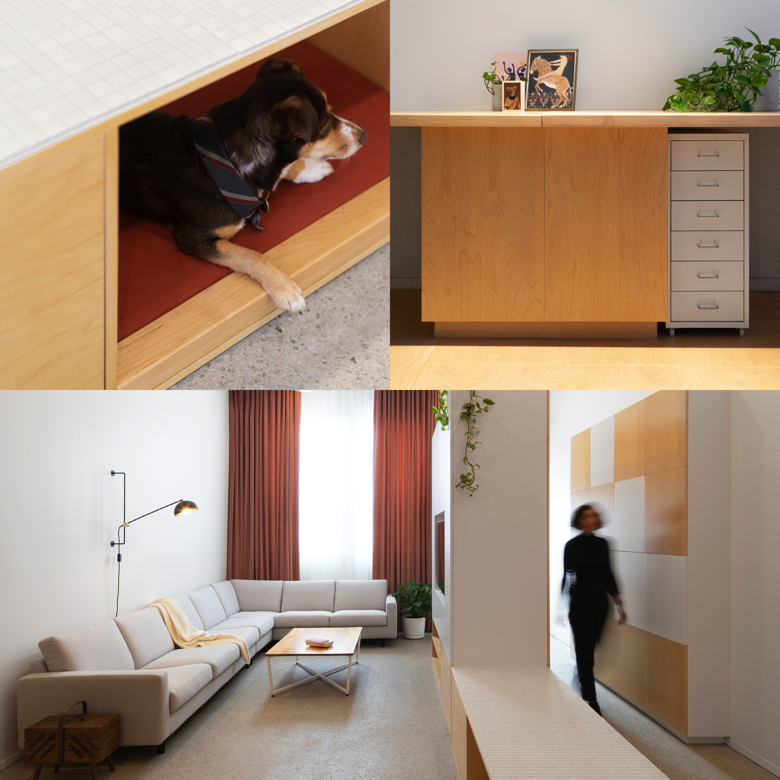 Les clientes souhaitaient créer des zones accueillantes dans leur loft. La difficulté ? L’espace très grand et en paliers. Le mobilier intégré permet de diviser tout en unifiant le logement. À l'entrée, un meuble multifonctionnel créer du rangement pour les vêtements, un banc/niche pour le chien et un espace pour la télévision. Ailleurs dans l'espace, nous avons conçu une banquette-vaisselier, ainsi que deux bureaux linéaires avec rangement adapté.