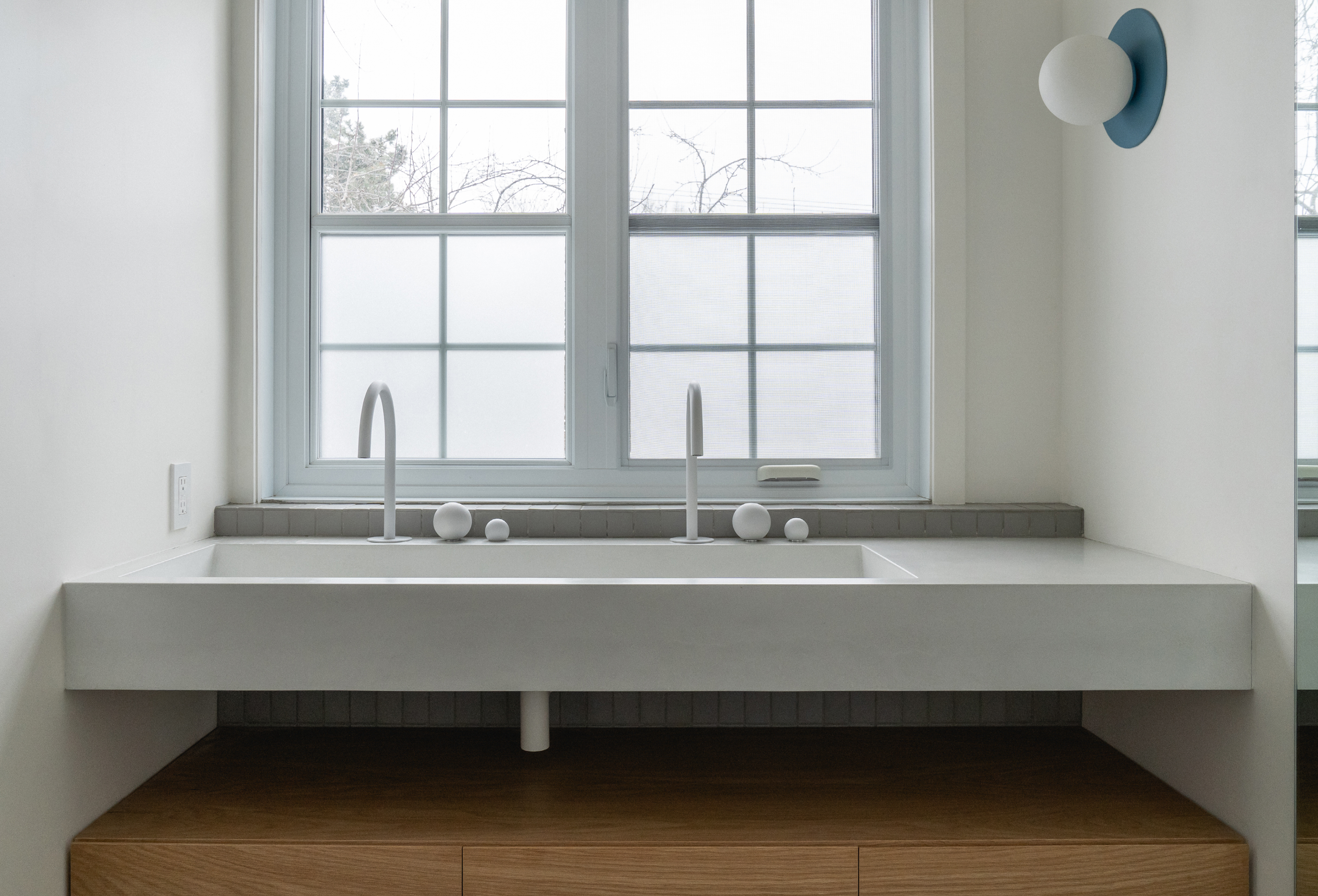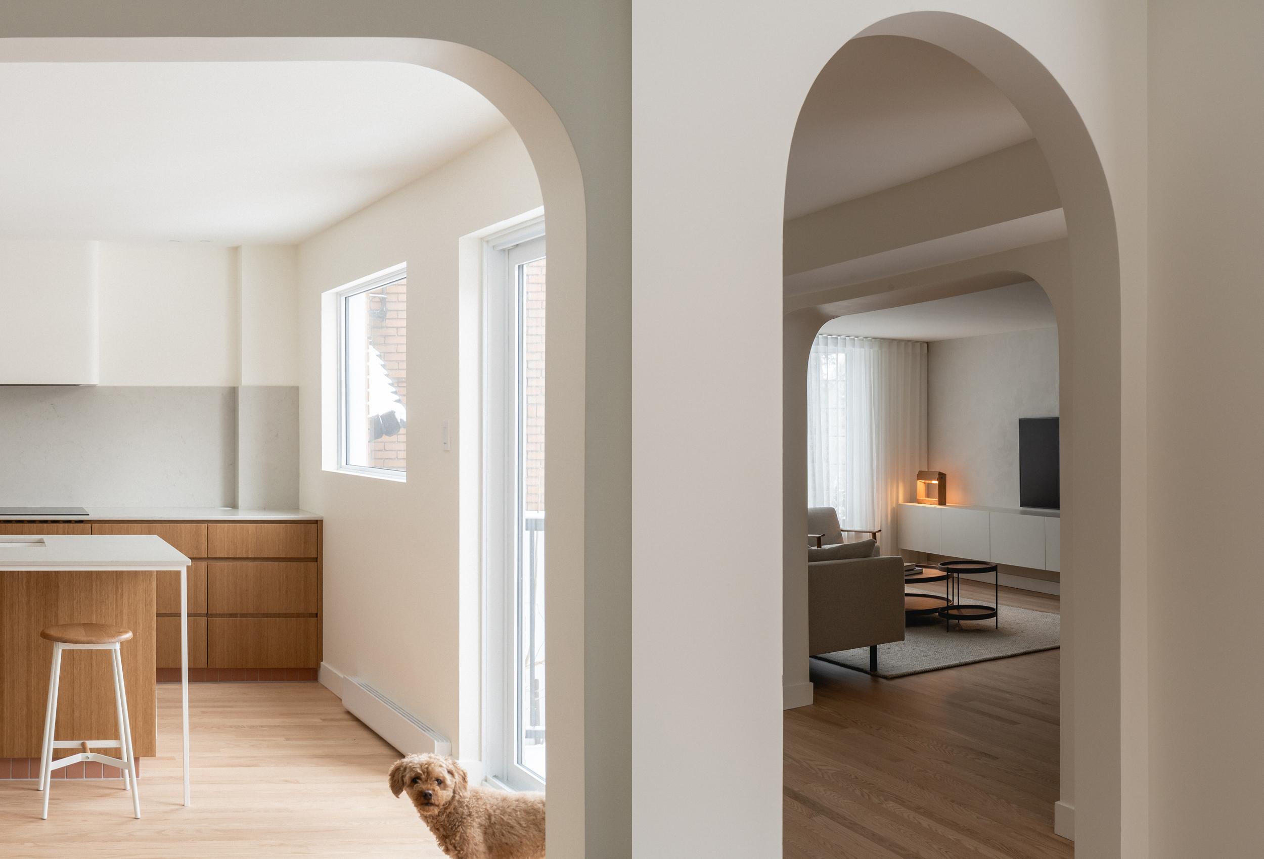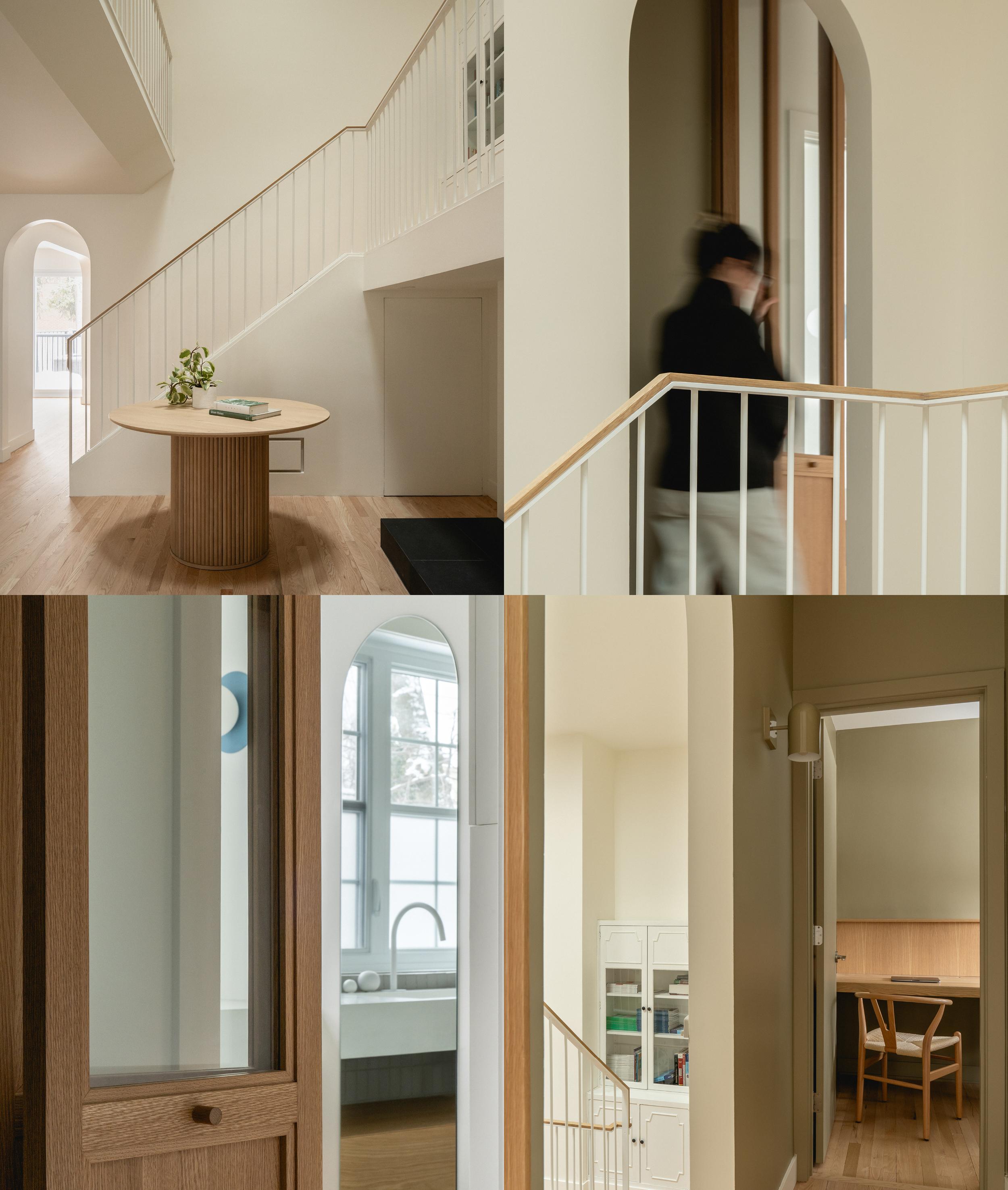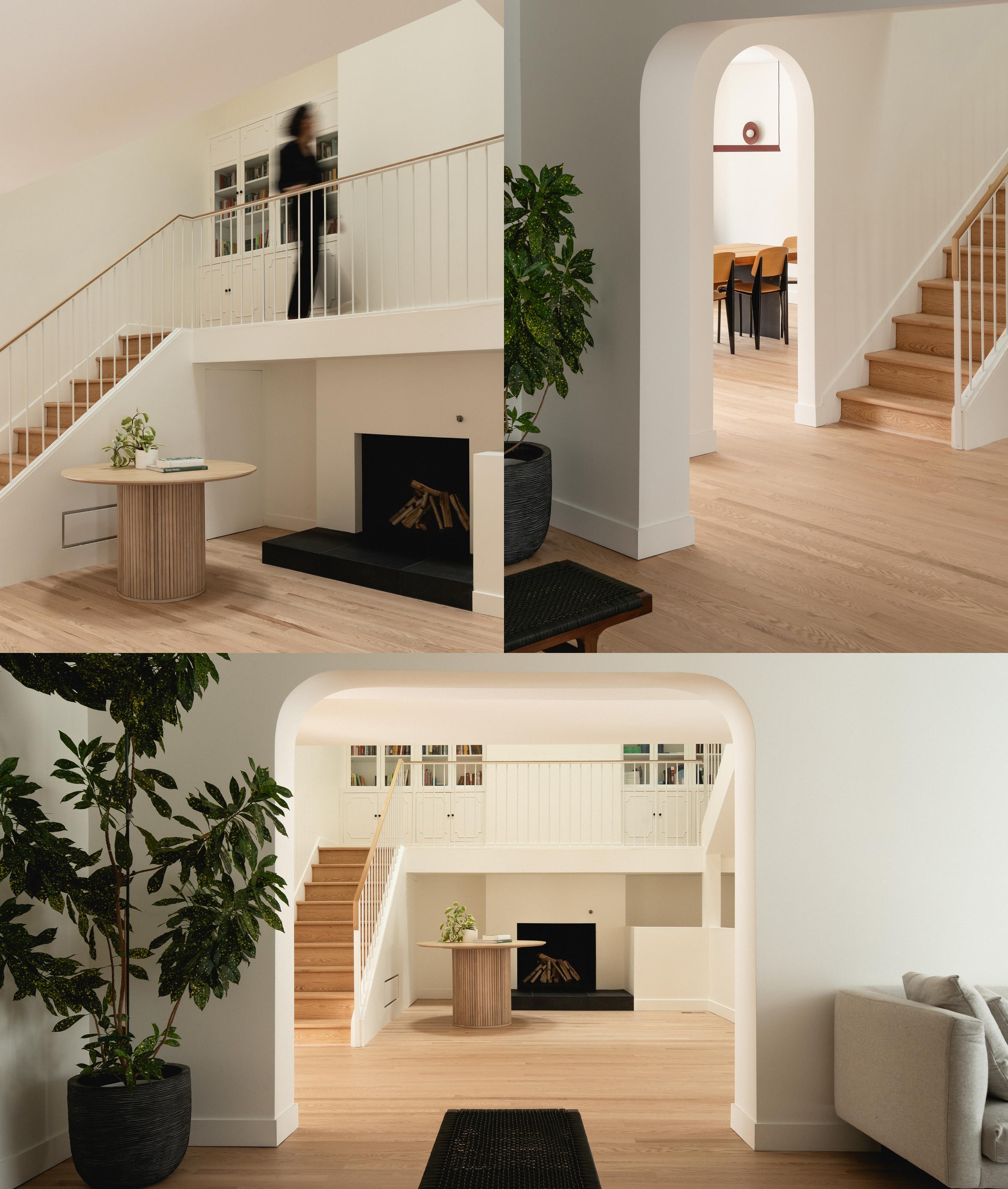 Suite à la demande d'une jeune famille de Montréal, le projet Roslyn visait à réaménager leur résidence afin d'optimiser l'espace autour du foyer, tout en connectant les espaces de vie et en réorganisant les chambres à l'étage. Pour atteindre une harmonie et une fluidité entre les pièces, des percées ont été créées et agrandies, établissant ainsi un lien visuel et physique entre la cuisine et la salle à manger, et une continuité entre le salon et le foyer. À l’étage, la chambre a été pensée comme un suite parentale intégrant un espace bureau, une salle de bain et une penderie derrière le lit.