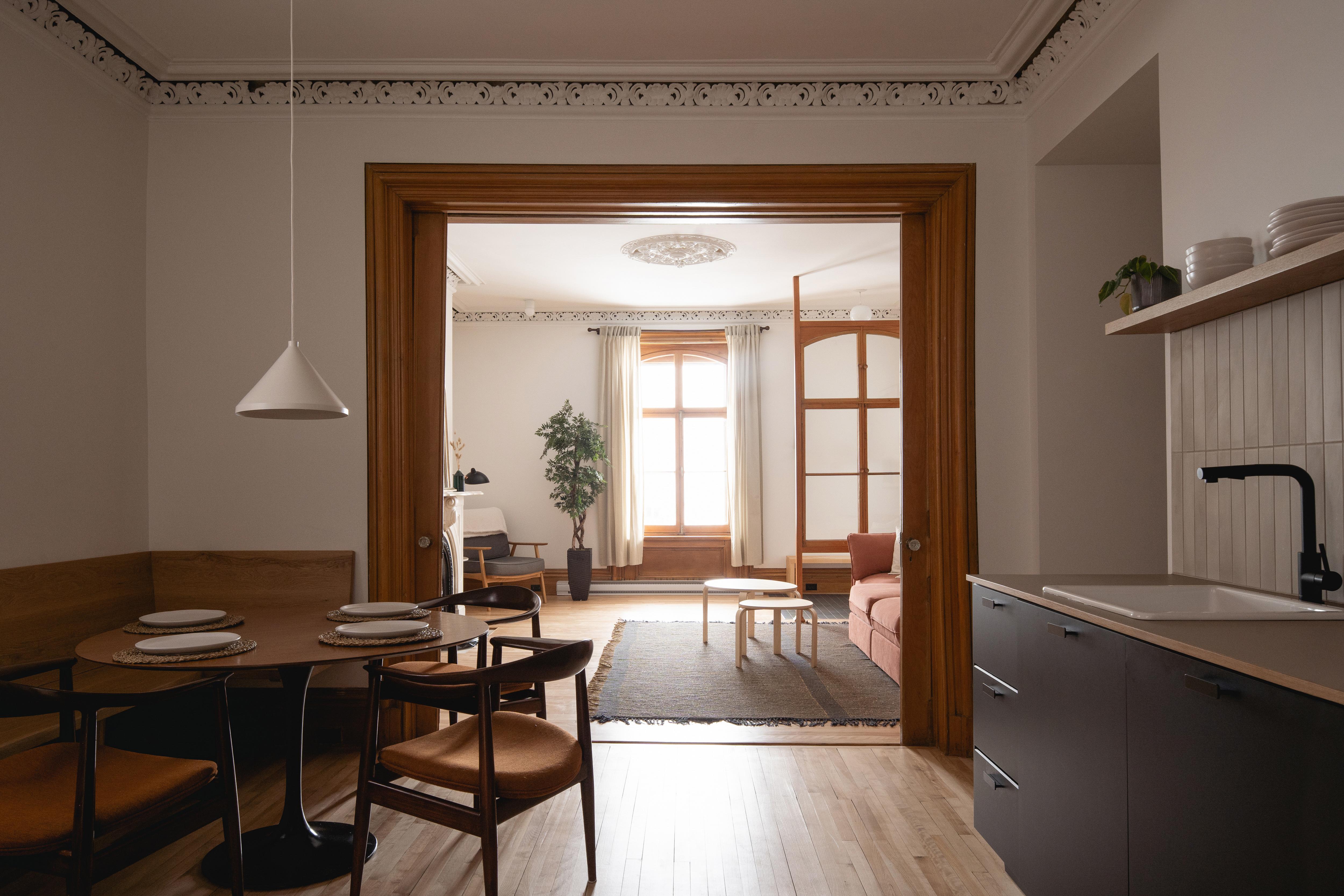 L’enjeu de ce projet était de convertir un ancien bureau de vente de voiliers en logement. Nous avons repensé l’aménagement de l’espace de manière à isoler les chambres à l’arrière du logement, accessible d’un passage intégrant un espace bureau. La cuisine au centre devient le lieu de rencontre et propose un espace banquette flexible. Nous avons conserver les éléments architecturaux existants tout en modernisant l’espace.