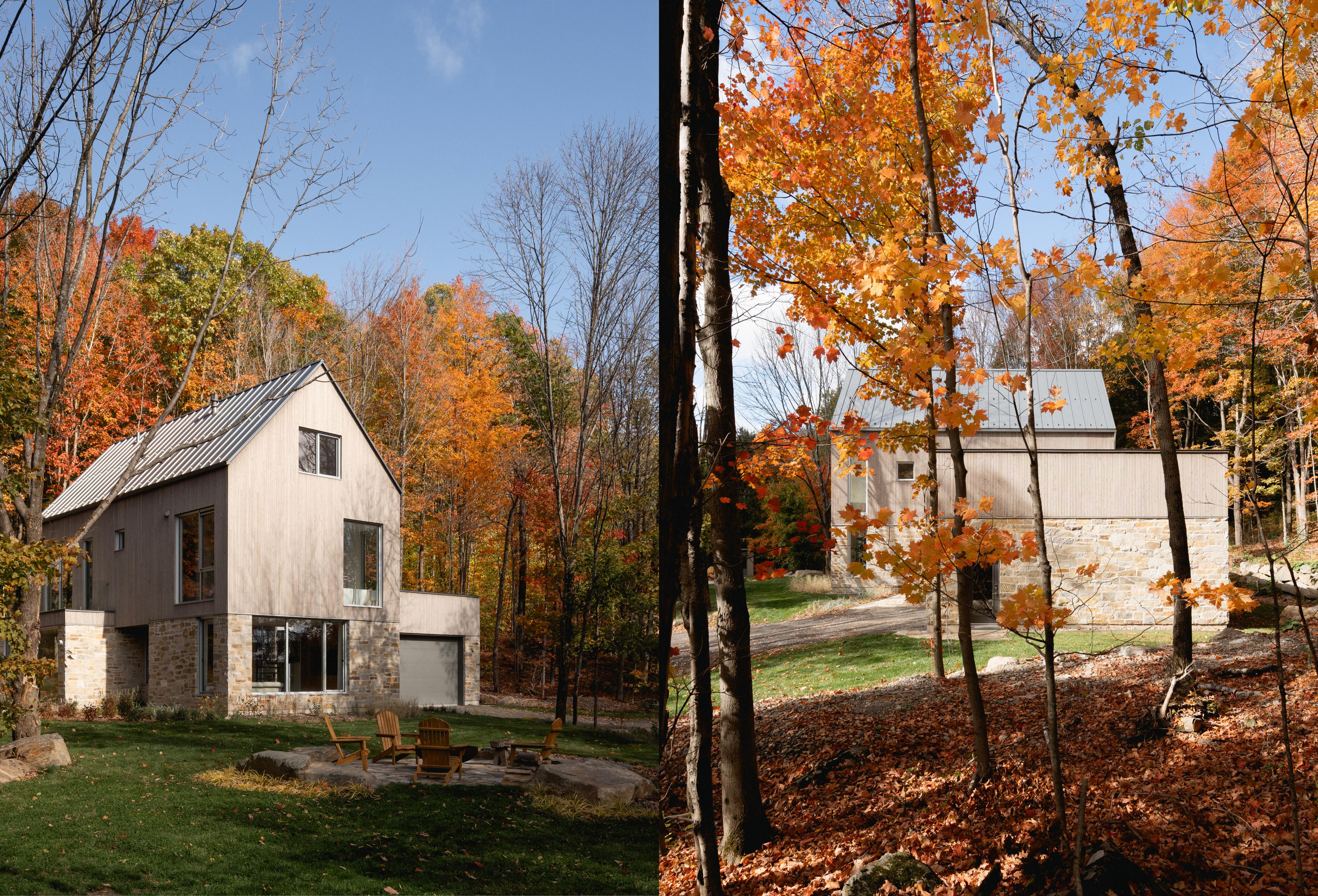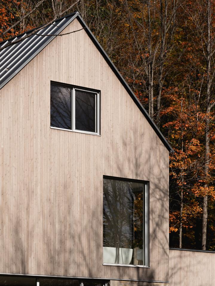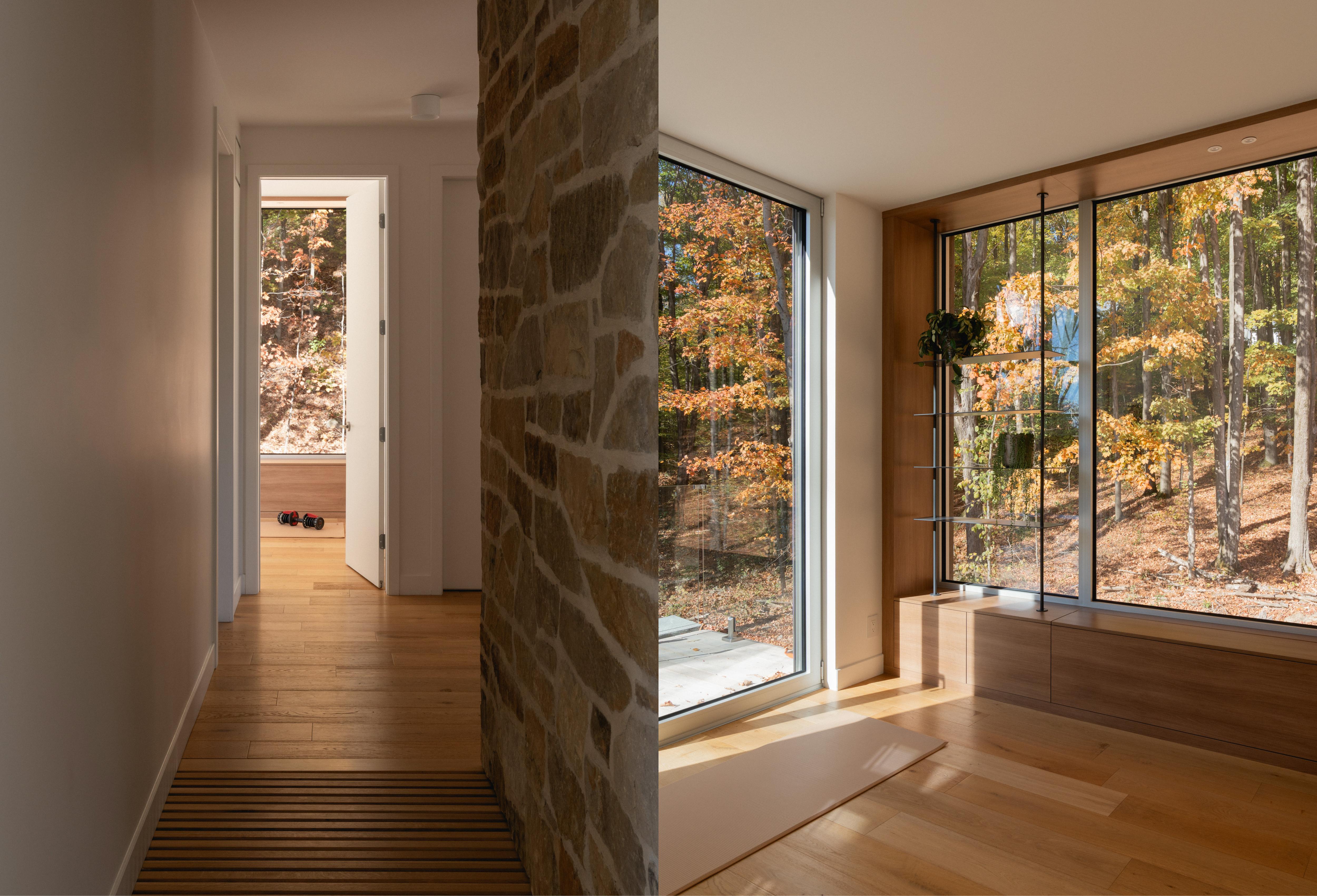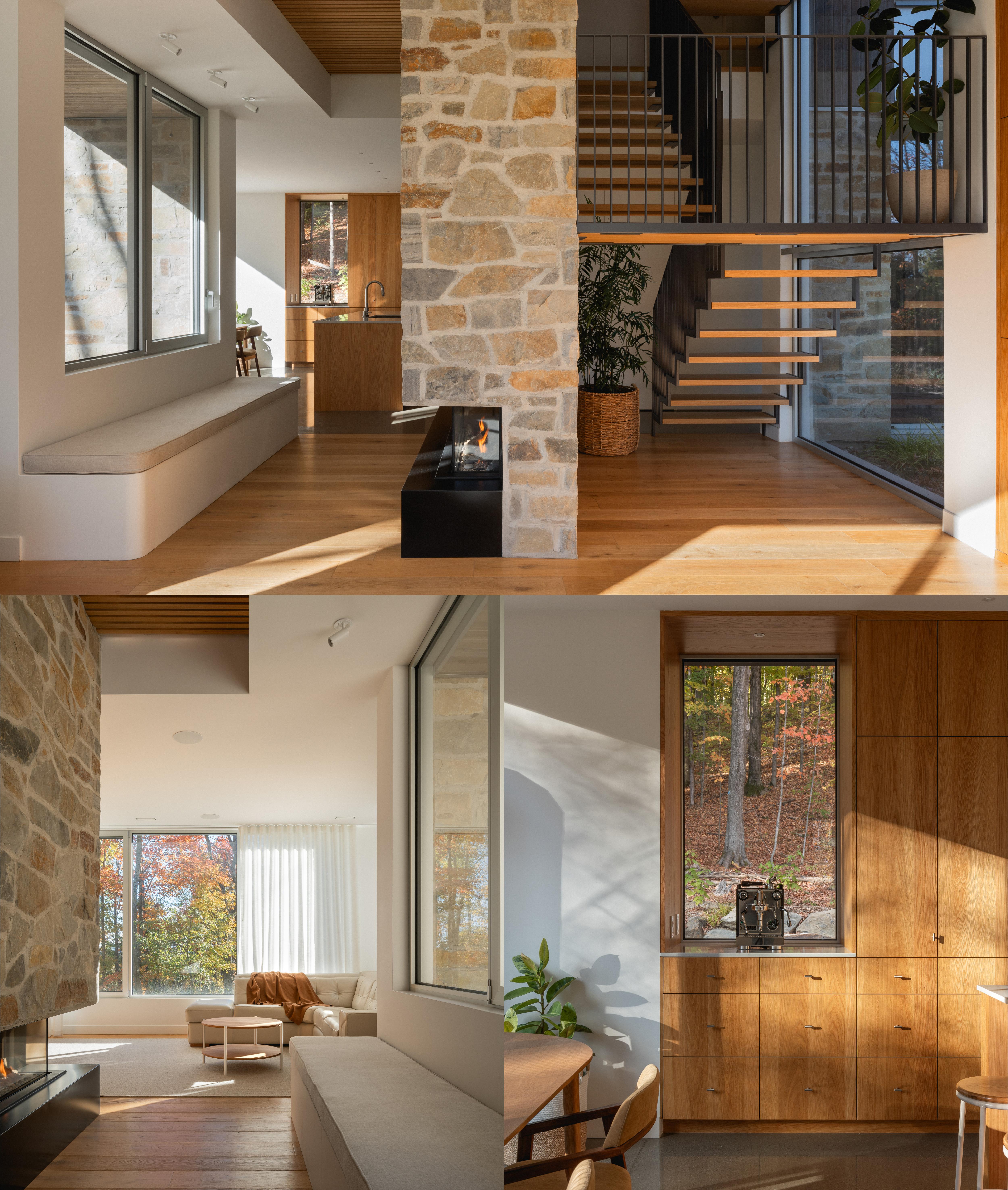 La matière boisée et la lumière naturelle définissent l’atmosphère comme si la forêt devient intègre à l'intérieur.