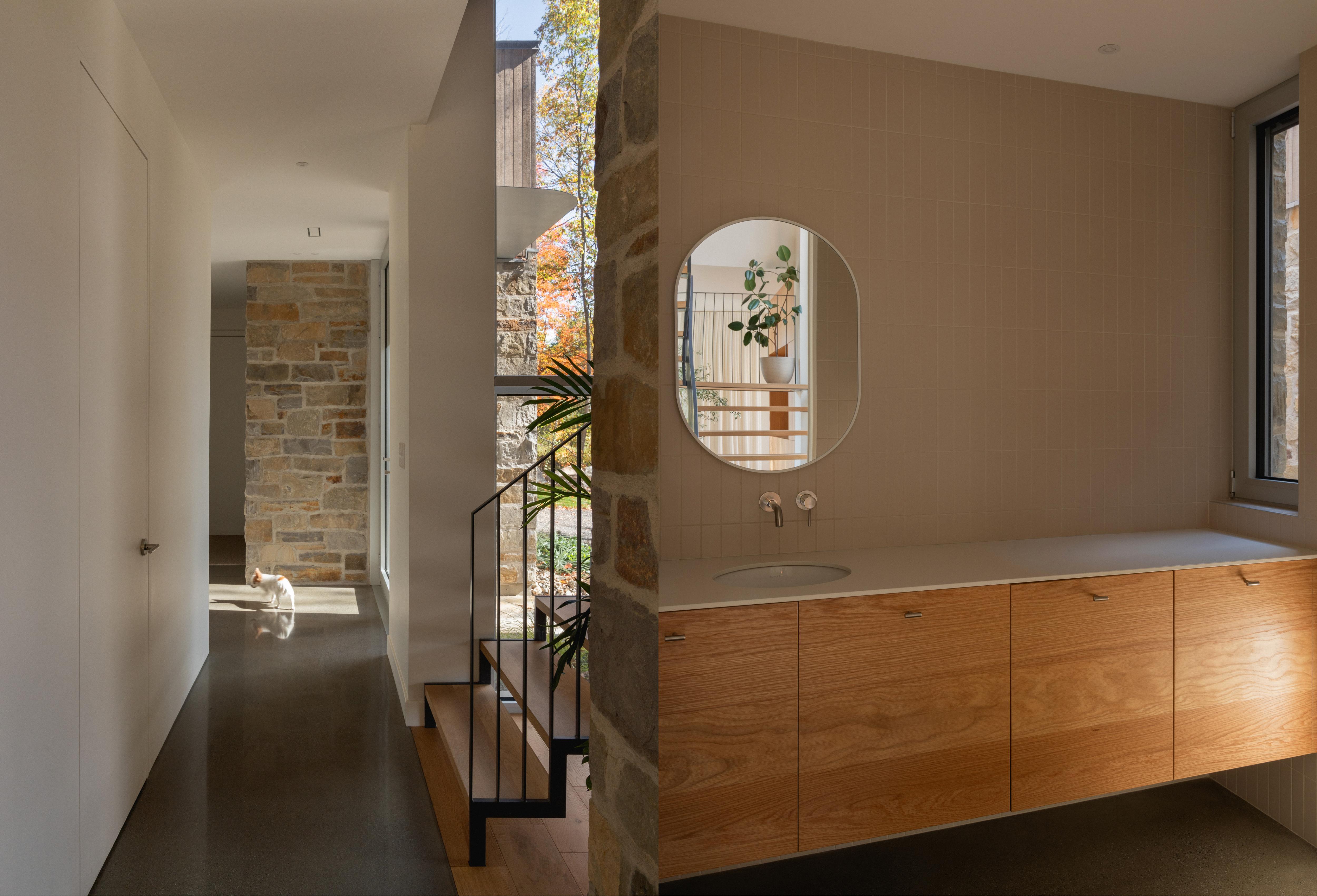L’unification des espaces par le choix de matériaux permet de créer une continuité chaleureuse au travers de la maison.