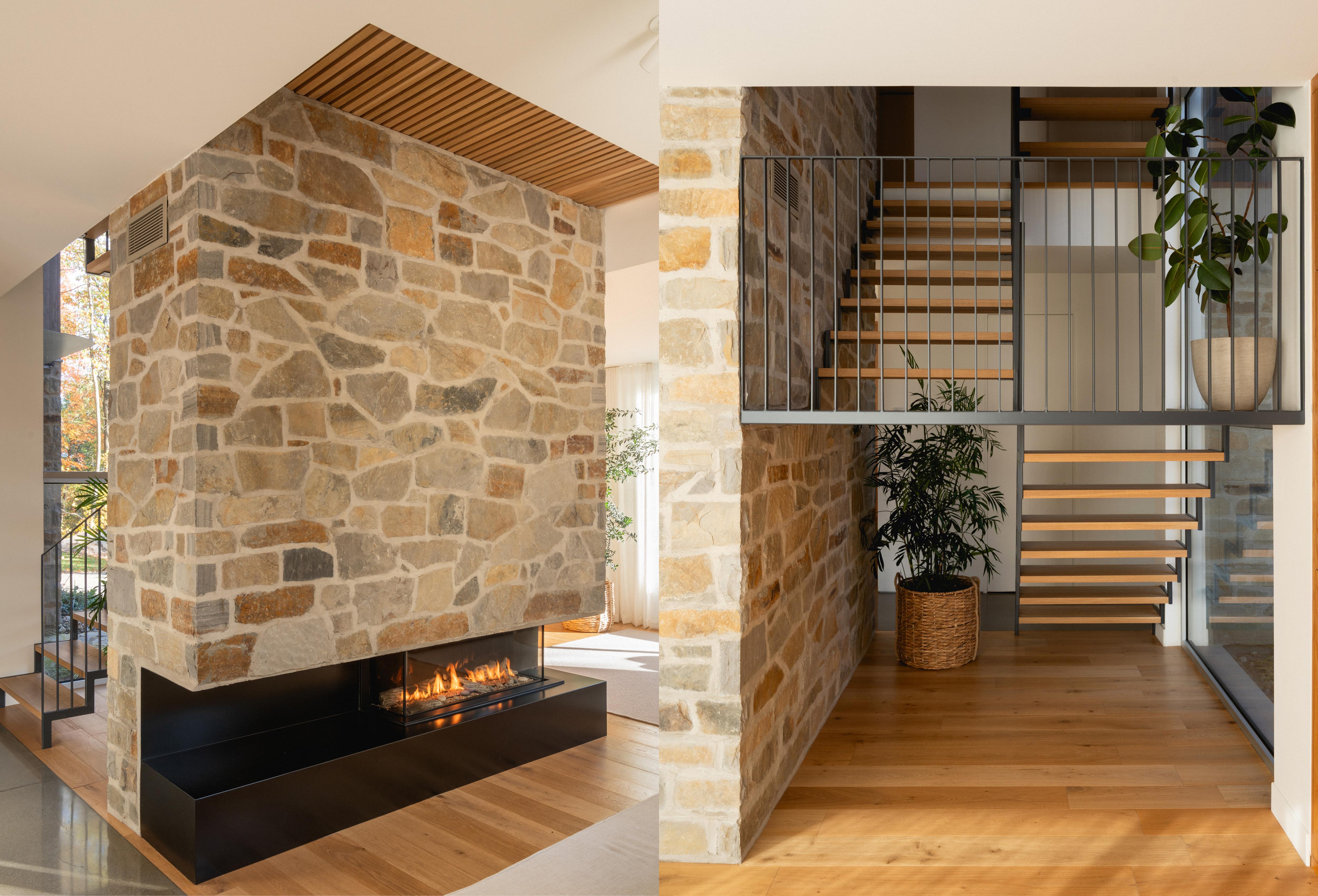 La pierre du revêtement extérieur est également présente sur le foyer renforçant le lien intérieur-extérieur.