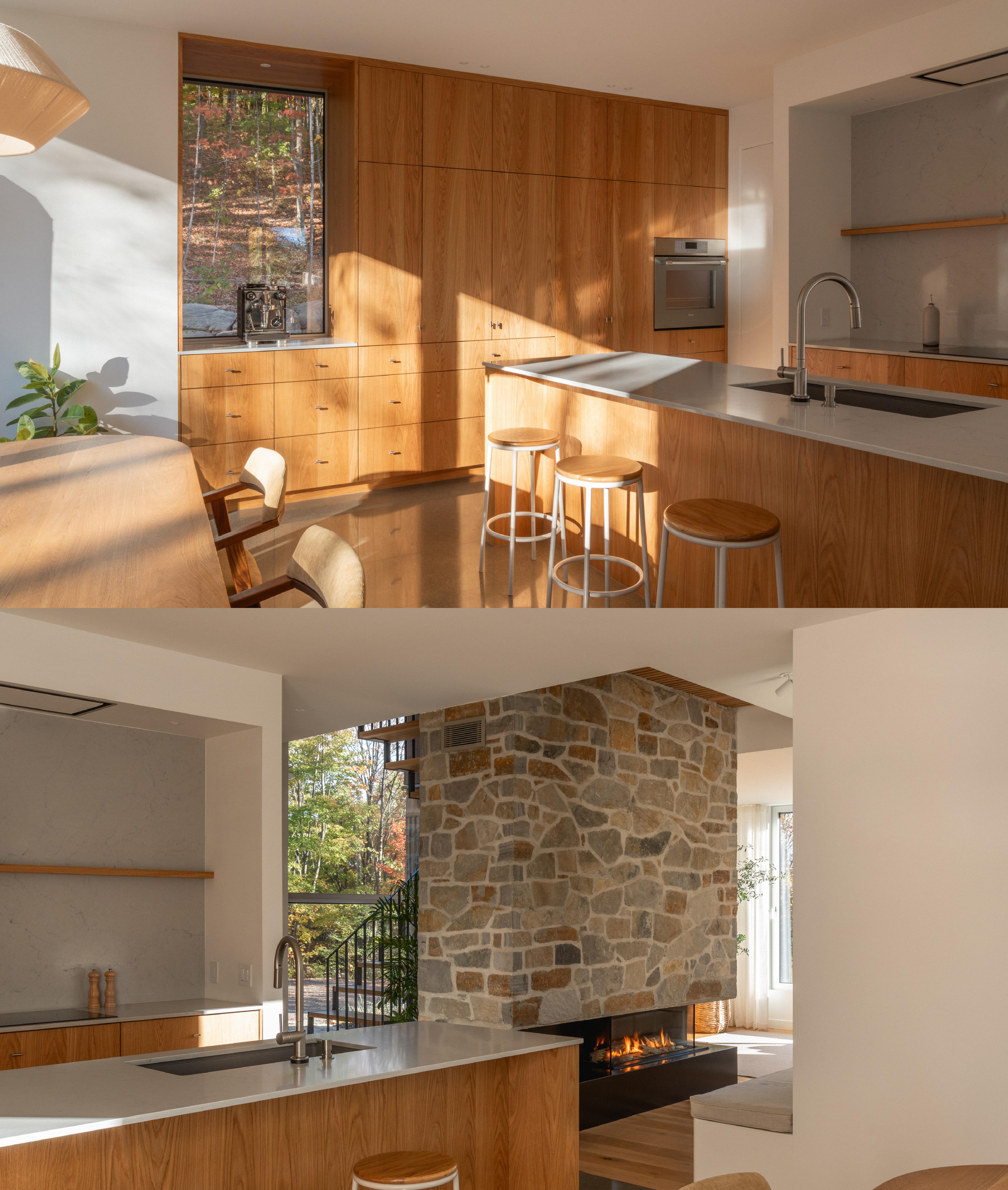 Au cœur du rez-de-chaussée, un foyer central agit comme masse architecturale et point d’ancrage, unifiant le salon et la cuisine. L’escalier à palier, sans contremarche, amplifie la perception de hauteur et allège cet élément structurant. La cuisine, conçue en longueur et intégrant la salle à manger, est baignée de lumière naturelle qui révèle la chaleur du bois.