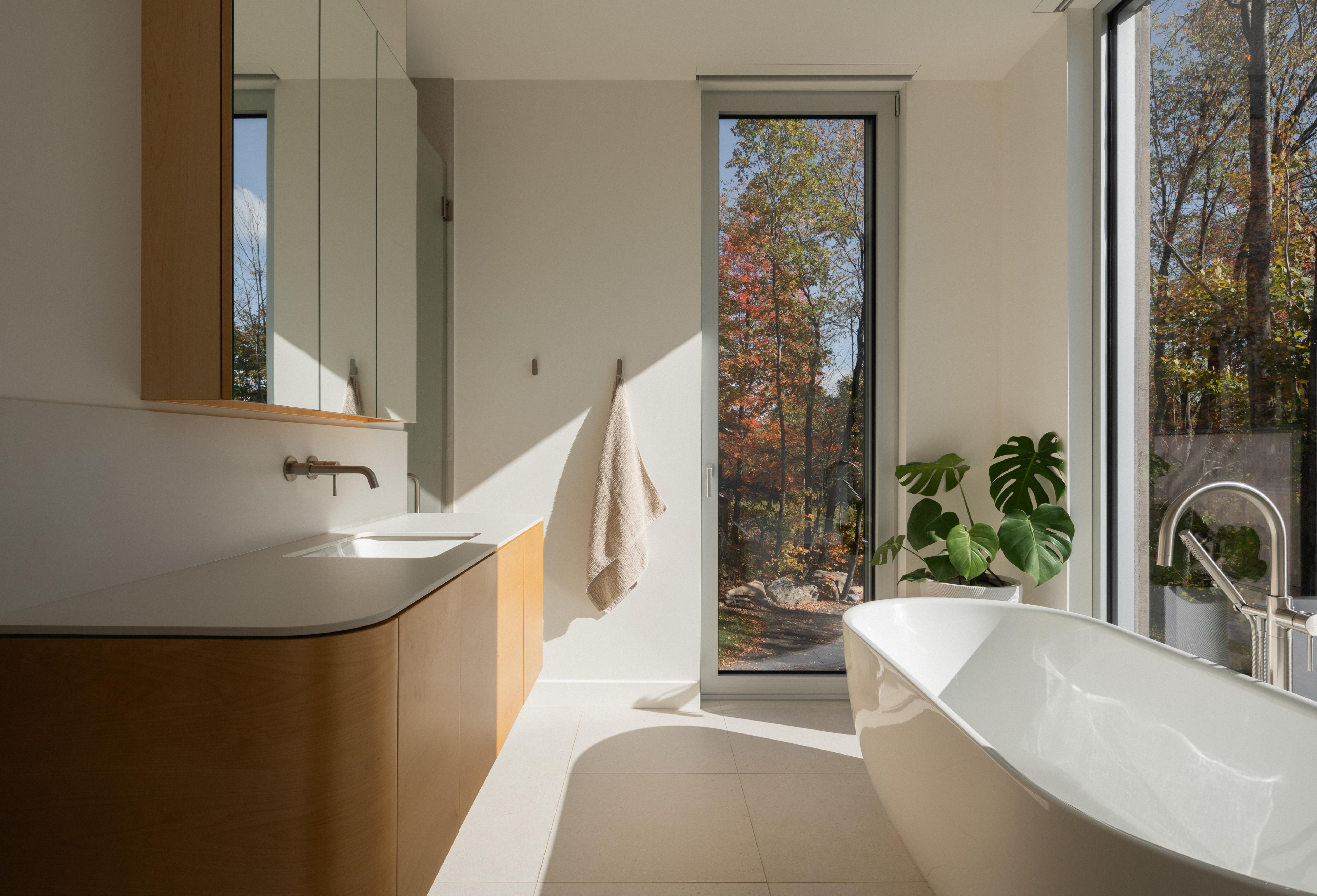 Dans la salle de bain, un espace de circulation est créé de part et d’autre de la vanité.