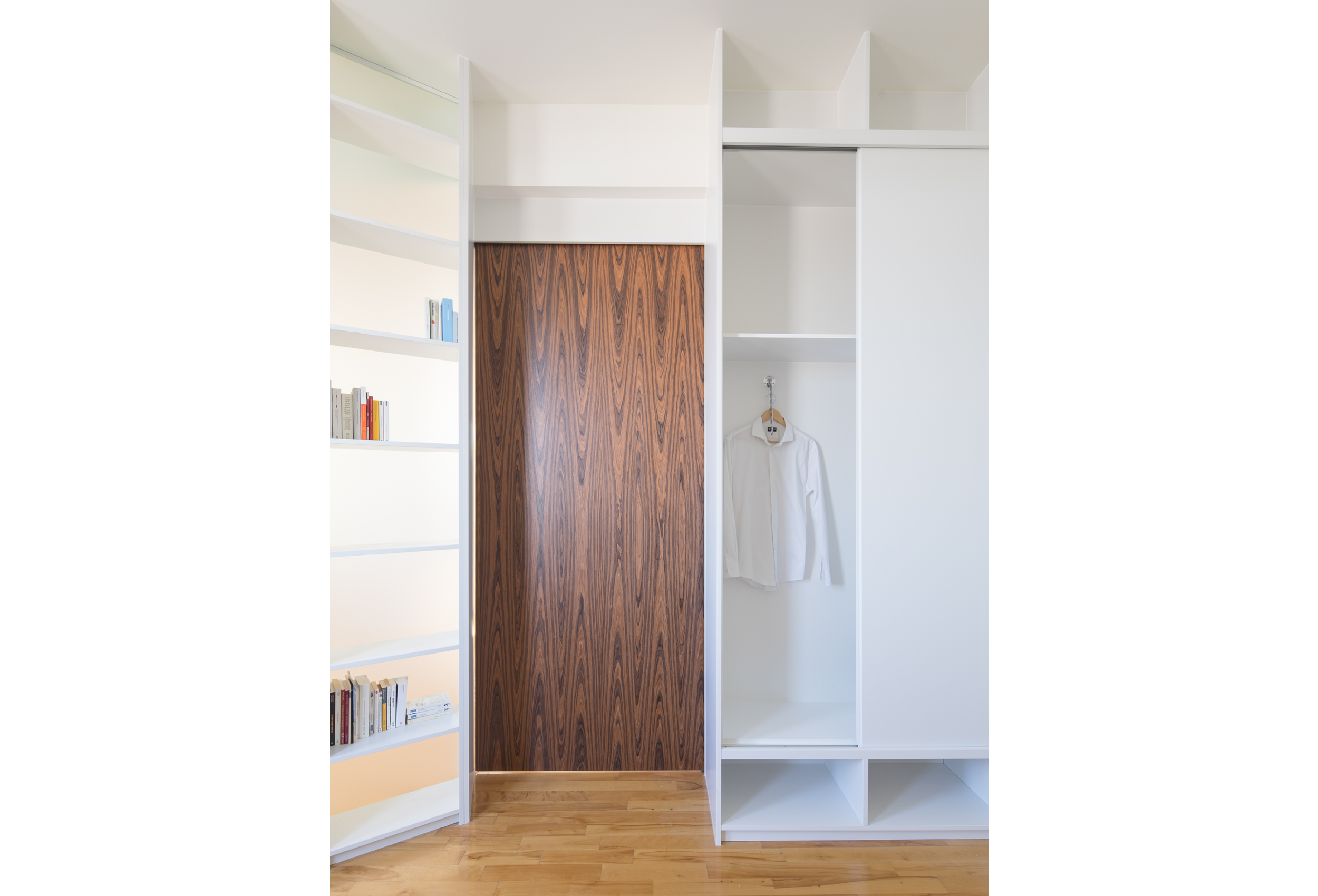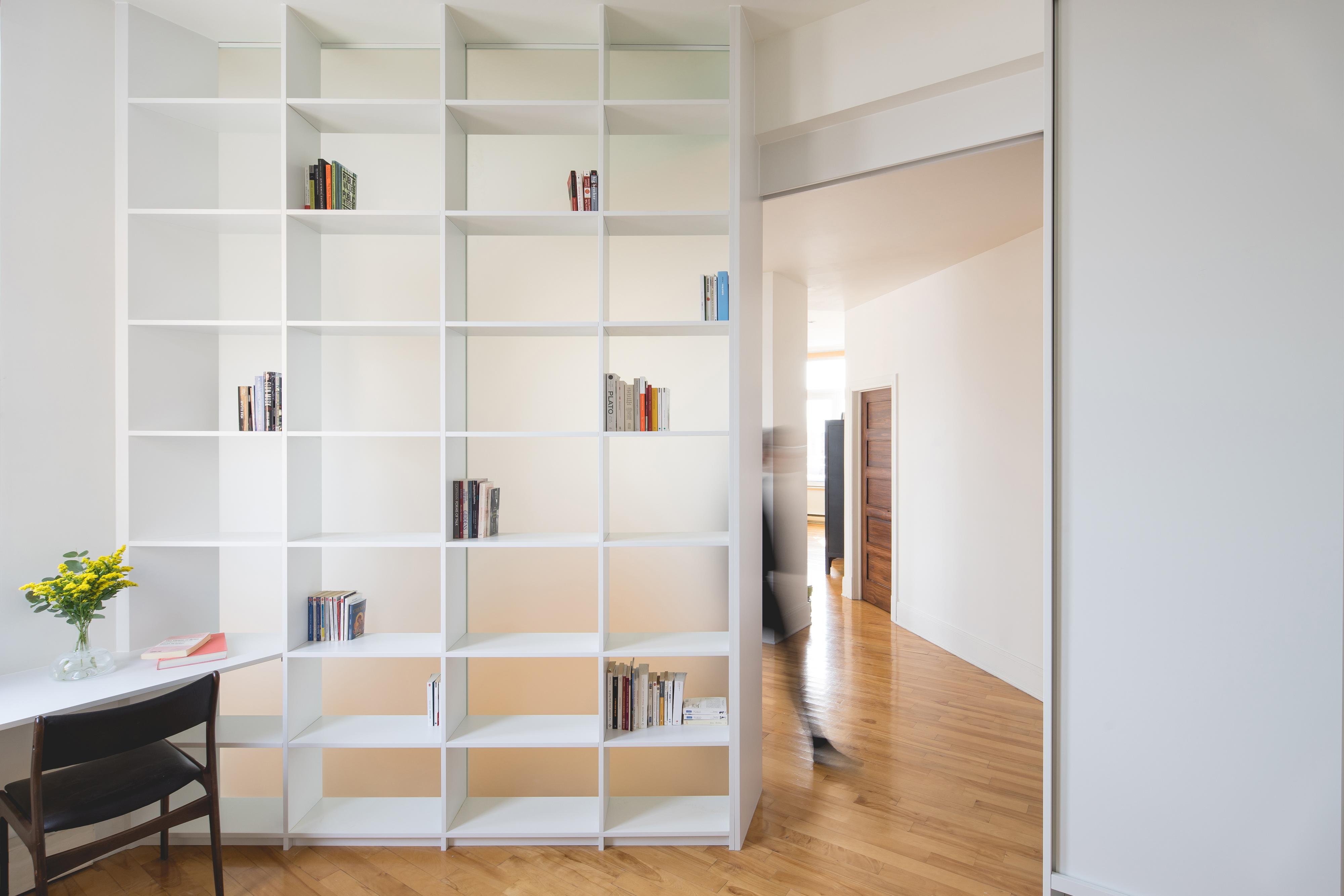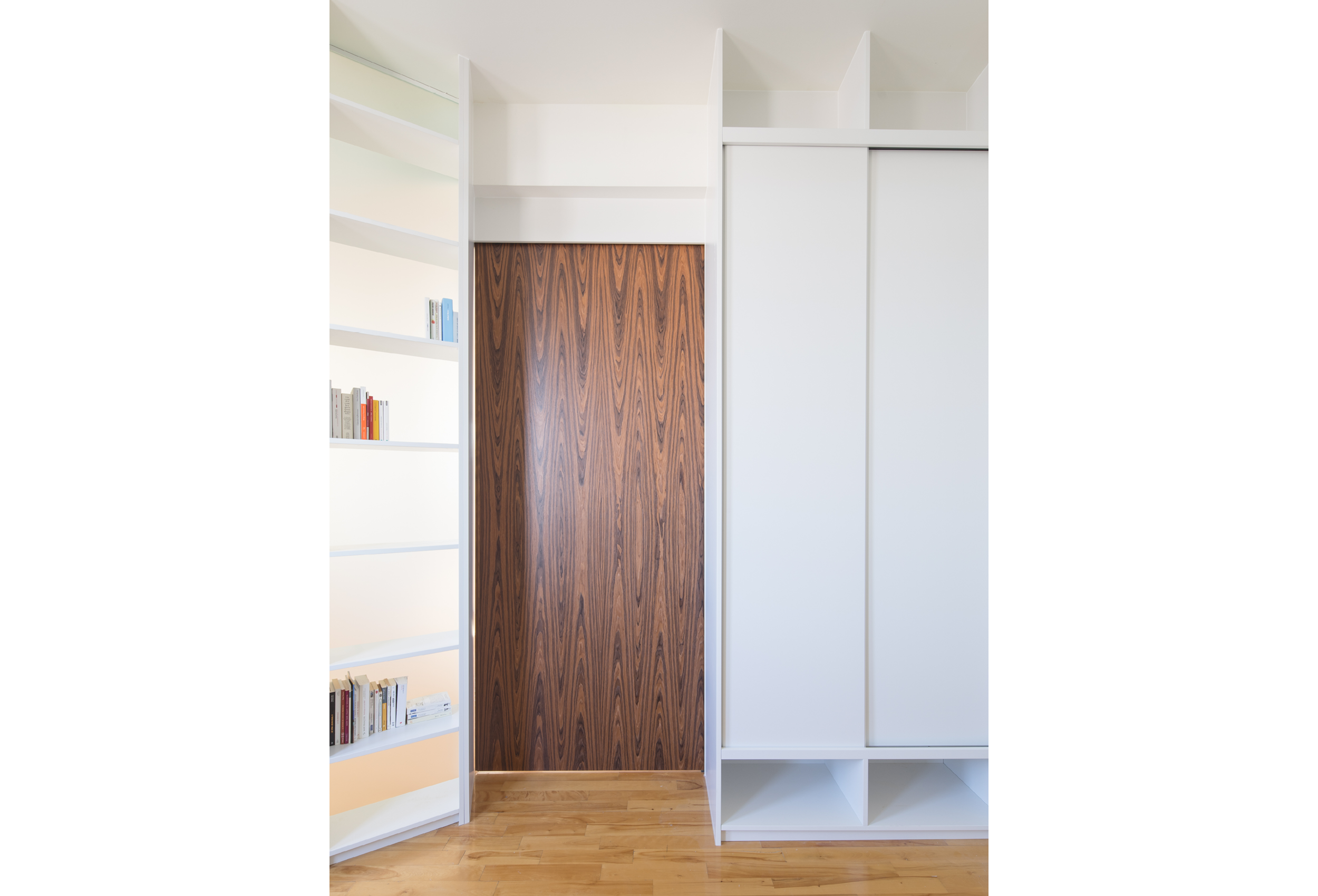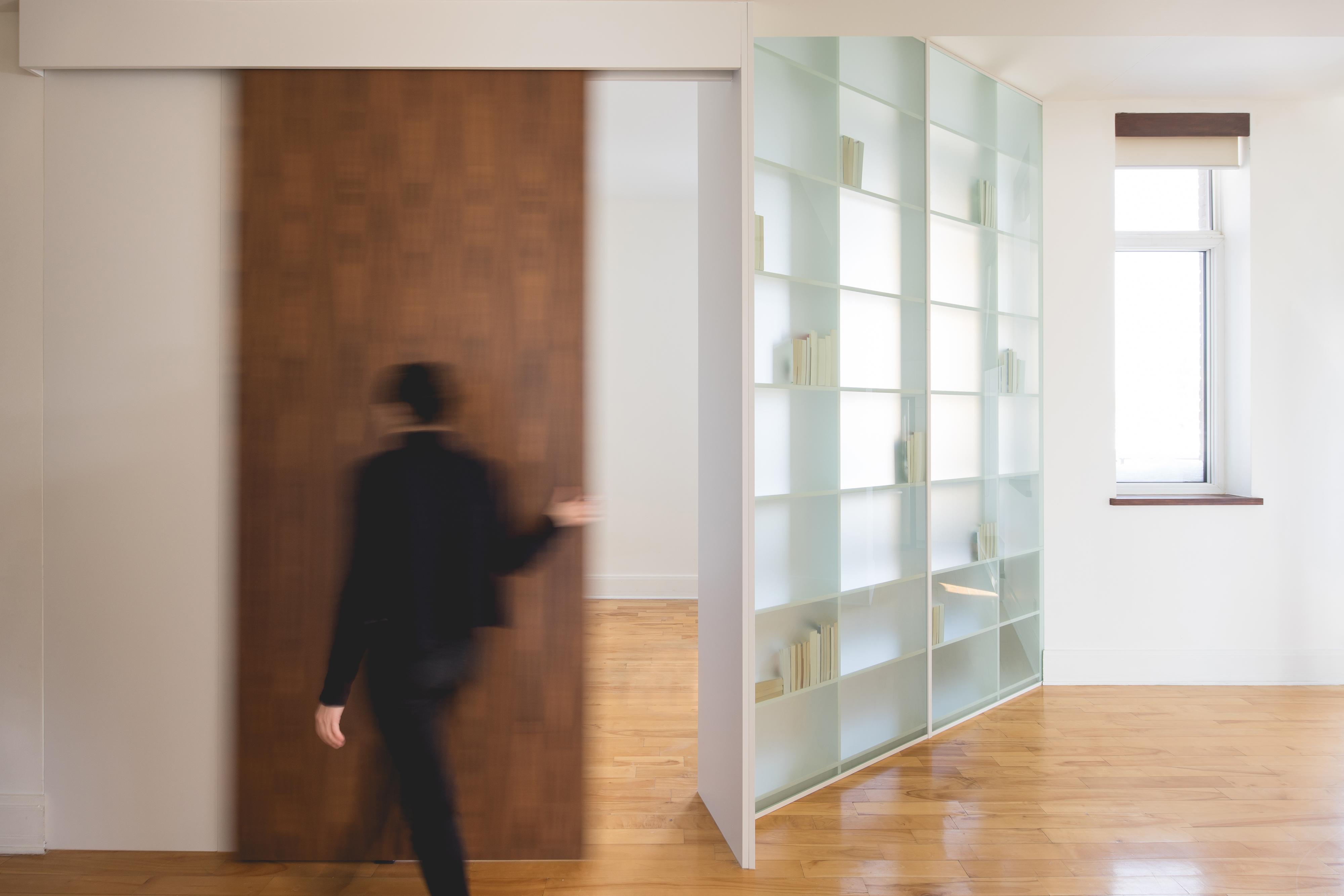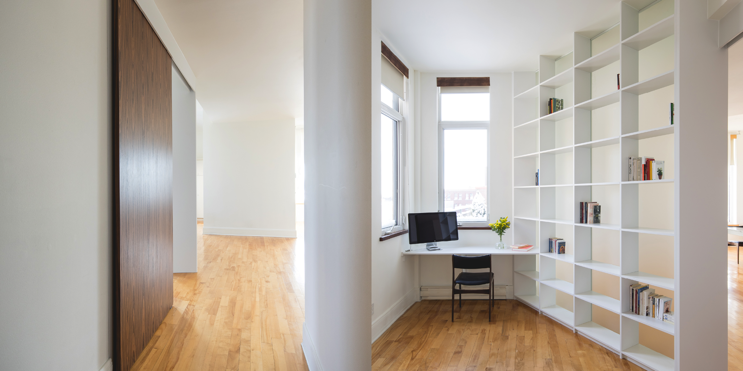 Le client souhaitait aménager une seconde chambre dans son condo pour un espace de travail/chambre d’amis. La contrainte ? Il voulait conserver la générosité et la luminosité de l’espace. Nous avons créer la nouvelle pièce par le billet de mobiliers architecturaux: un rangement fermé et une bibliothèque. La bibliothèque positionnée en angle vers les espaces communs, est munie d’une paroie givrée qui permet à la lumière de pénétrer. Finalement, une grande porte coulissante relie les deux sections afin de créer l’ouverture de la pièce.