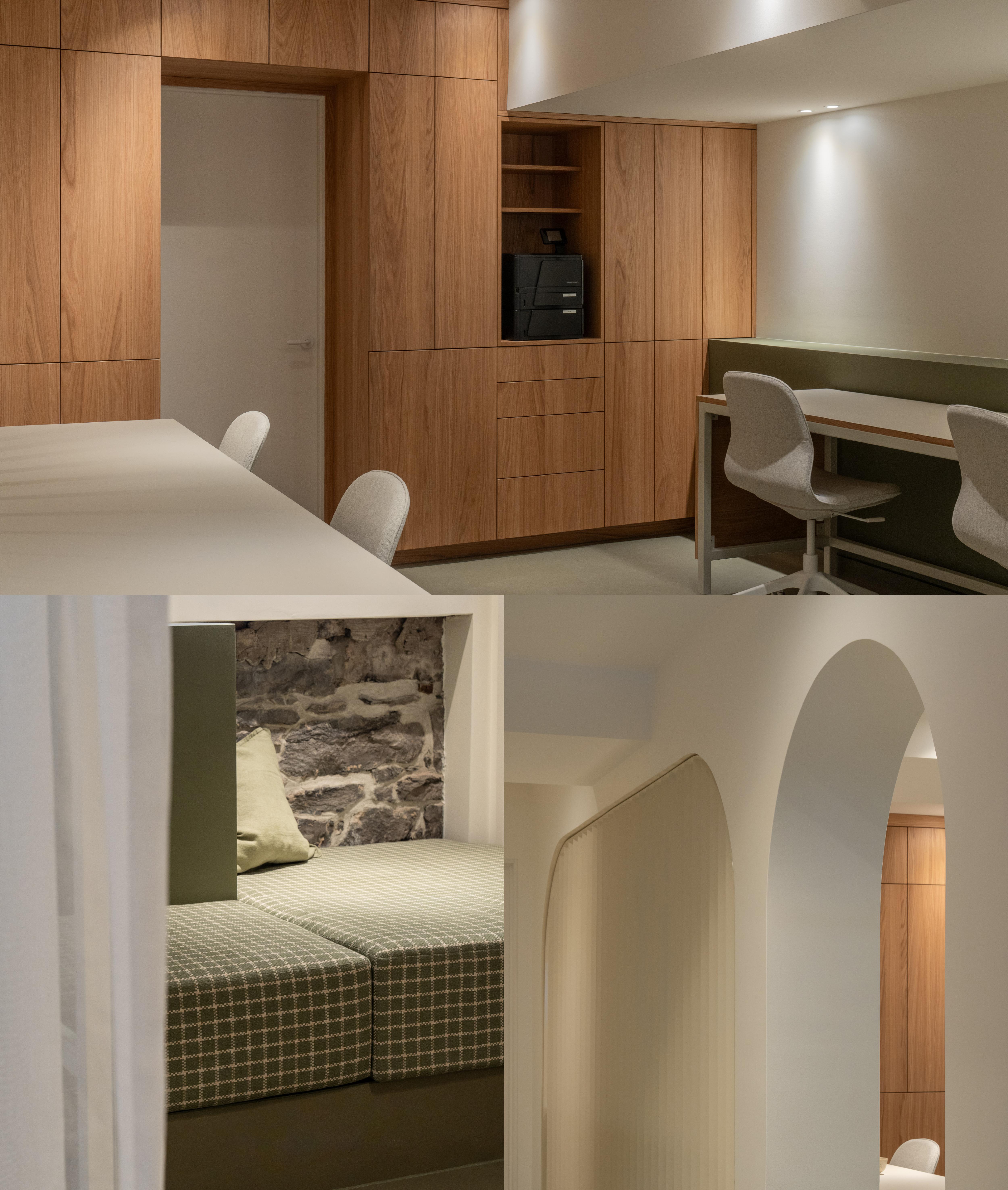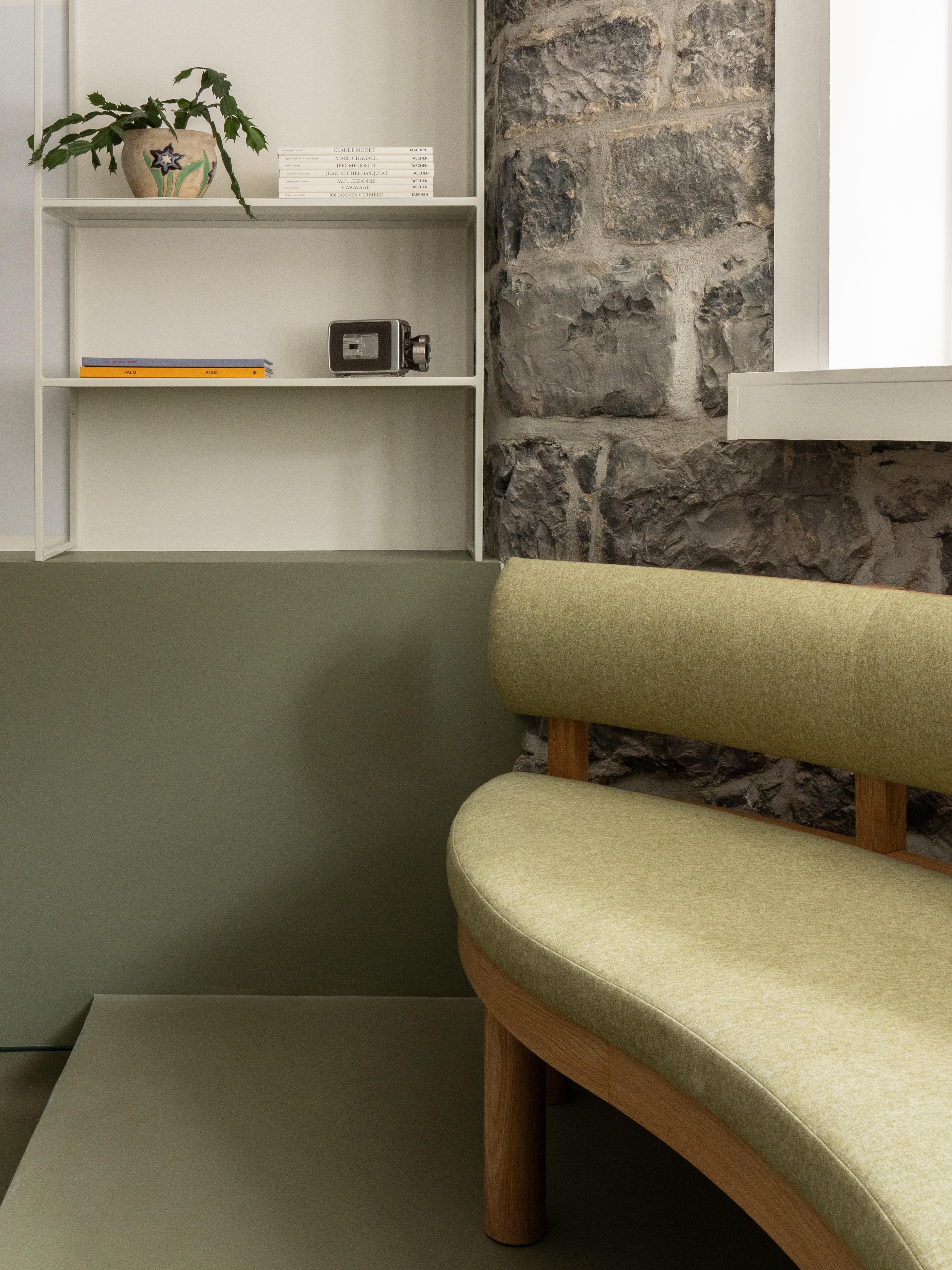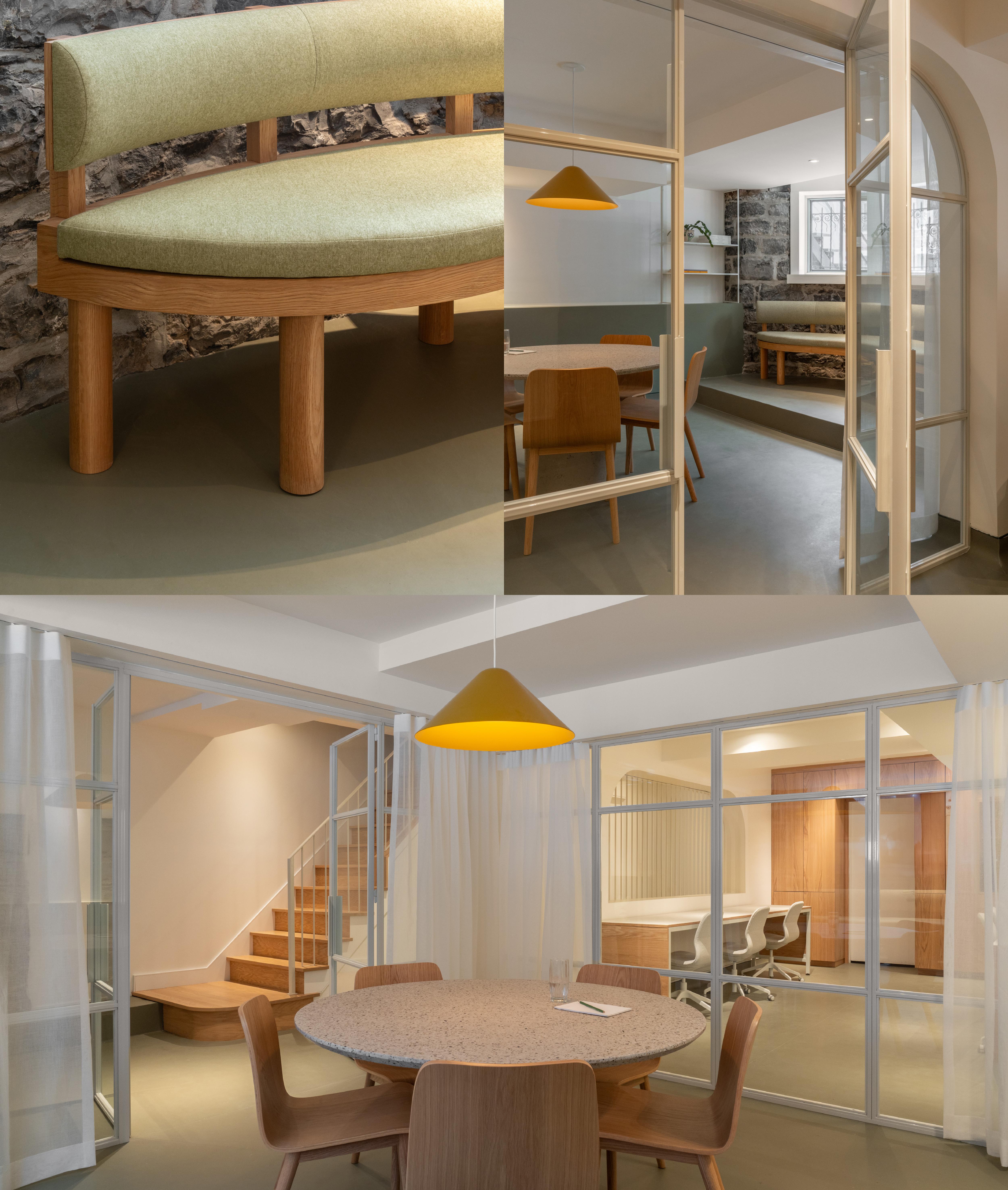 La banquette sous la fenêtre introduit une note décontractée dans la salle de réunion.