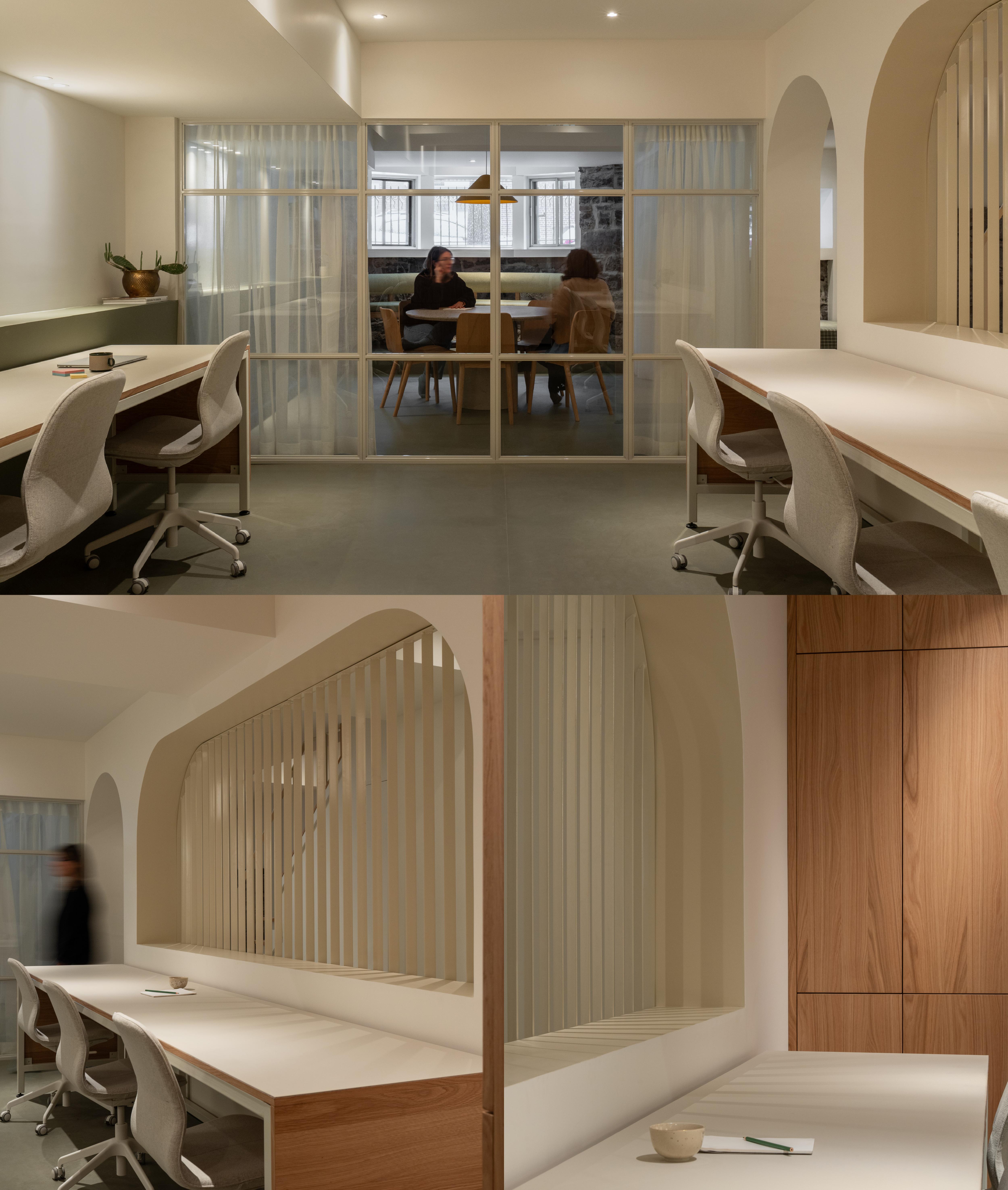 Le sous-sol a été repensé en espace collaboratif réunissant six postes de travail et une zone de conférence divisée par une verrière qui diffuse la lumière naturelle. La polyvalence a guidé la conception, offrant des espaces adaptables. L'aménagement intègre du rangement optimisé, une reconfiguration de la salle de bain et du mobilier sur mesure, dans une ambiance contemporaine assumée, distincte du reste de la maison.