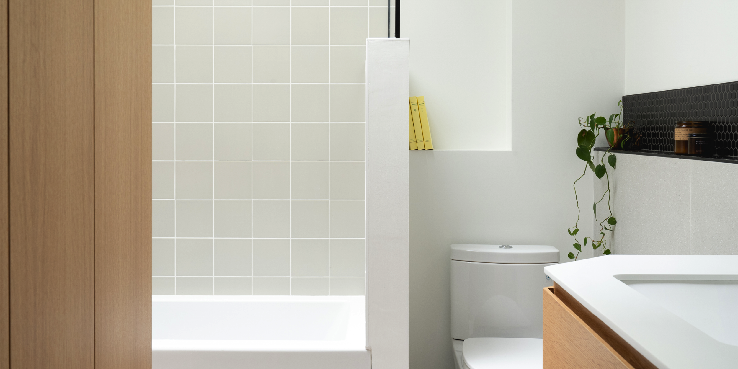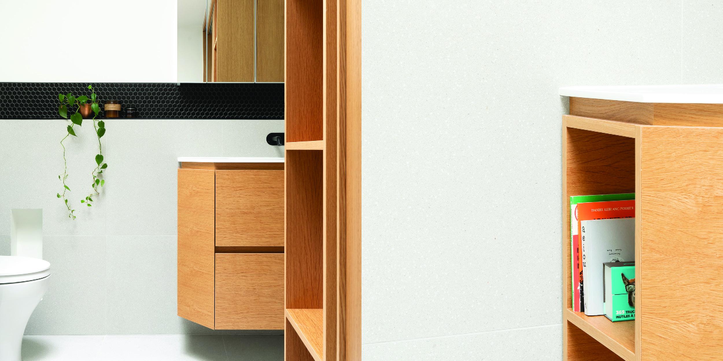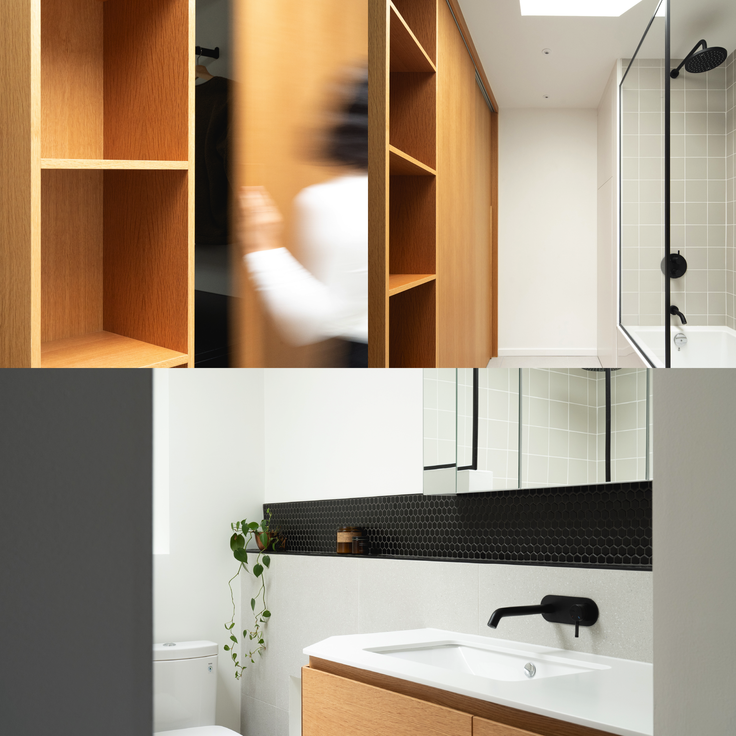 Les clients désiraient rendre leur salle de bain plus fonctionnelle. Le problème ? Le manque de rangement et l’étroitesse des lieux. Nous avons conçu du mobilier adapté qui permet d'optimiser chaque coin de l’espace et de dissimuler les équipements. Les matériaux aux couleurs simples et le puit de lumière accentue la chaleur du bois, générant un espace serein.